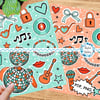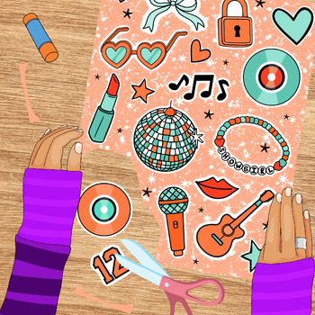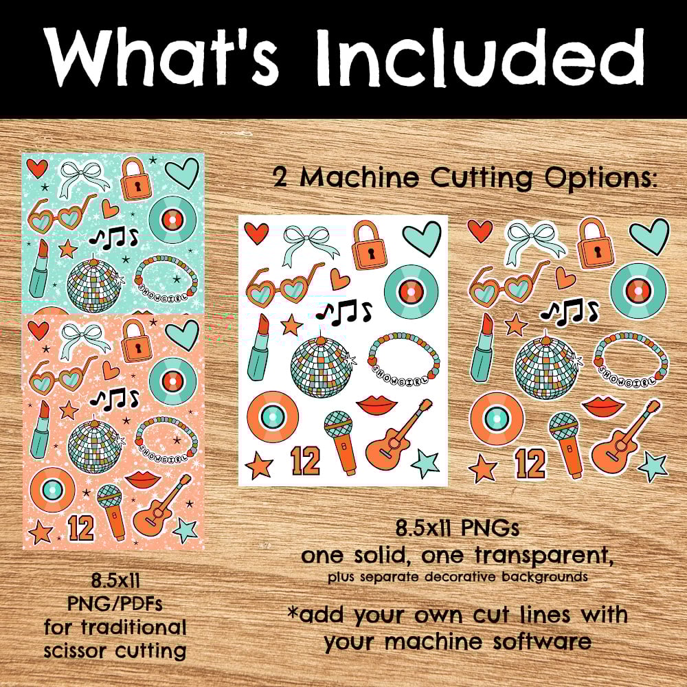 Print and cut sticker sheets with a TS Show Girl theme, featuring bows, locks, bracelets, vinyl records, lipstick, disco balls and more.