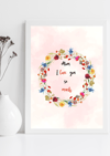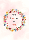 Watercolor bright colored flower wreath with the text "Mum I love you so much". A lovely gift for Mother's Day, a birthday gift for mom, or a surprise gift for your mom or mother-in-law.