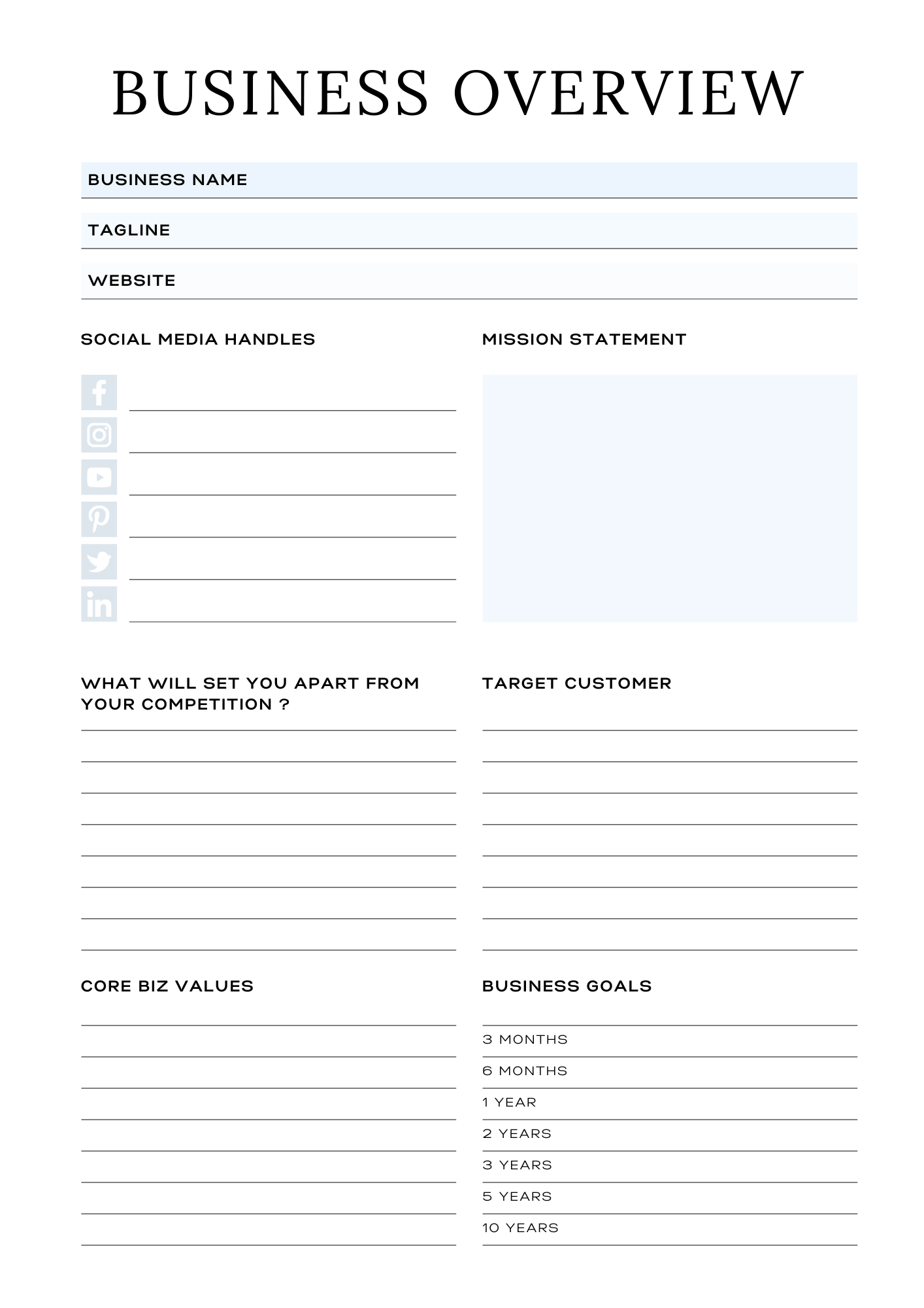 - Business Overview & Goal Setting: Define your mission, core values, and set measurable goals for 3 months to 10 years.