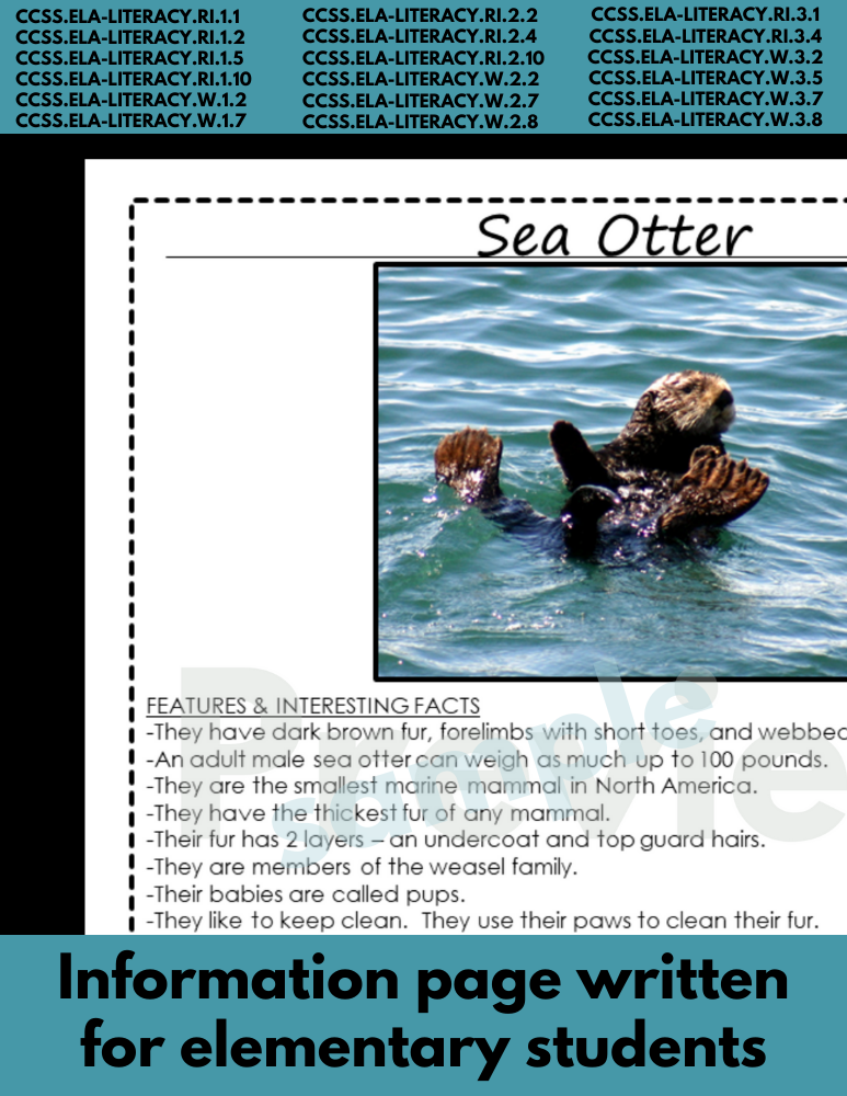 Ocean Animal Research SEA OTTER Reading and Writing pages for Animal Reports