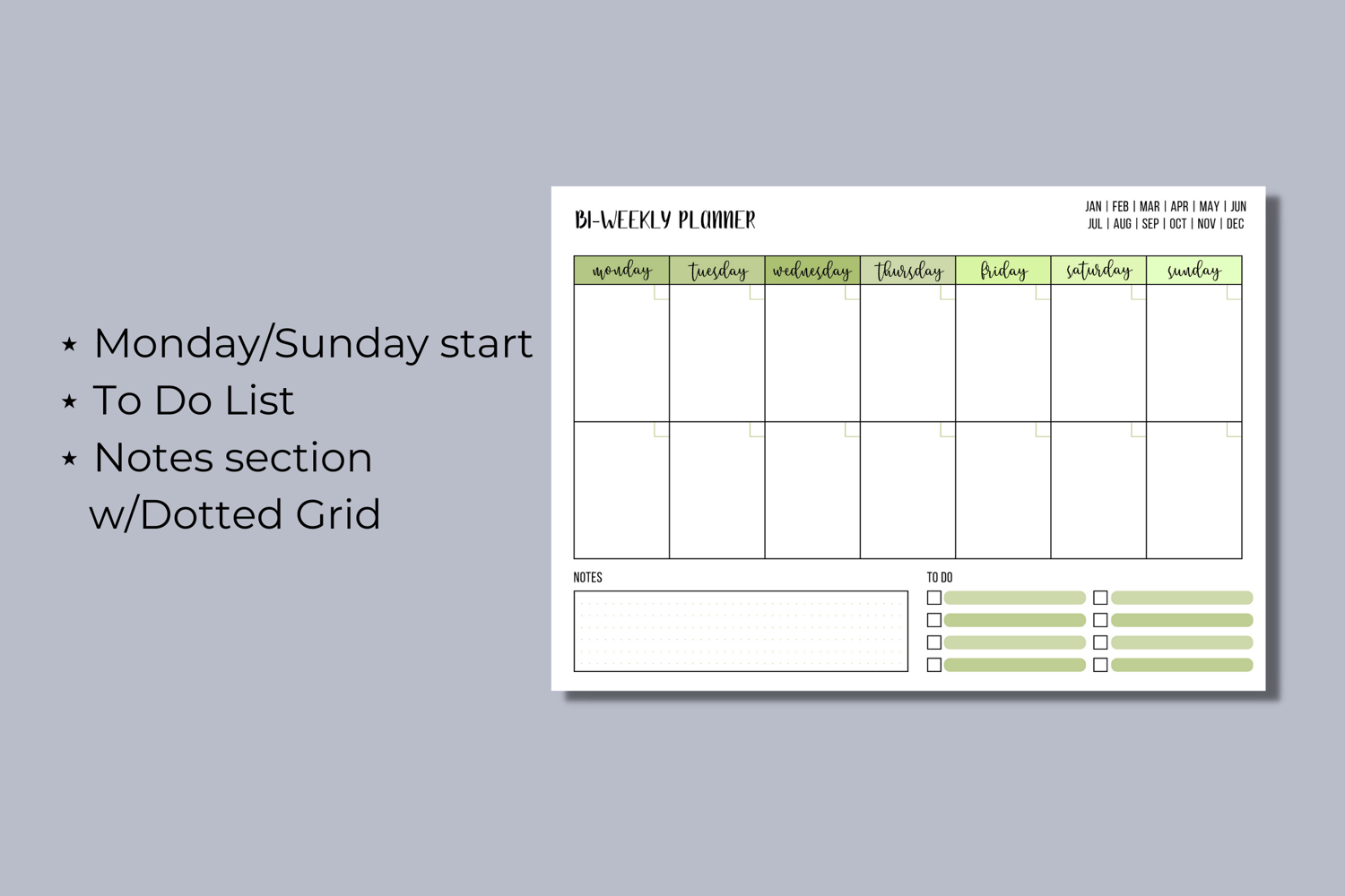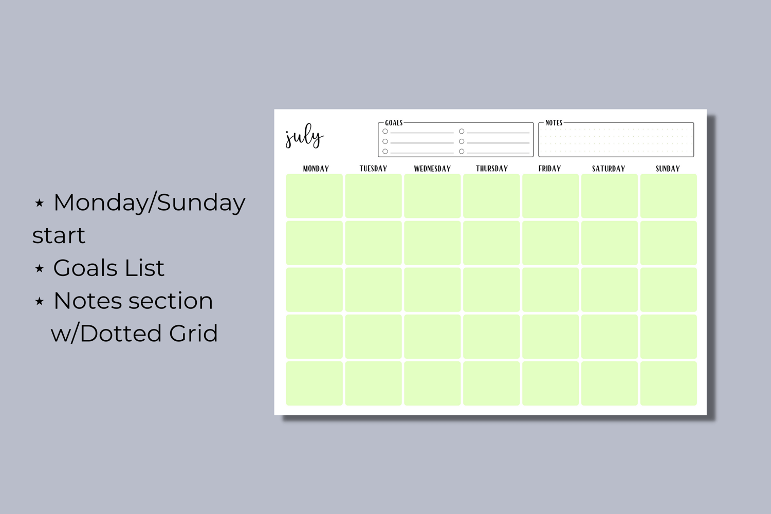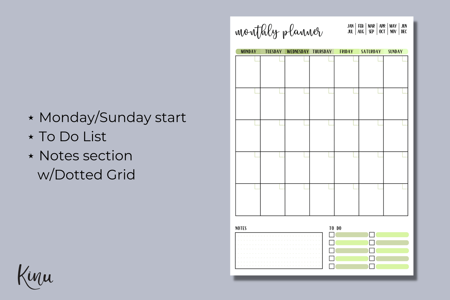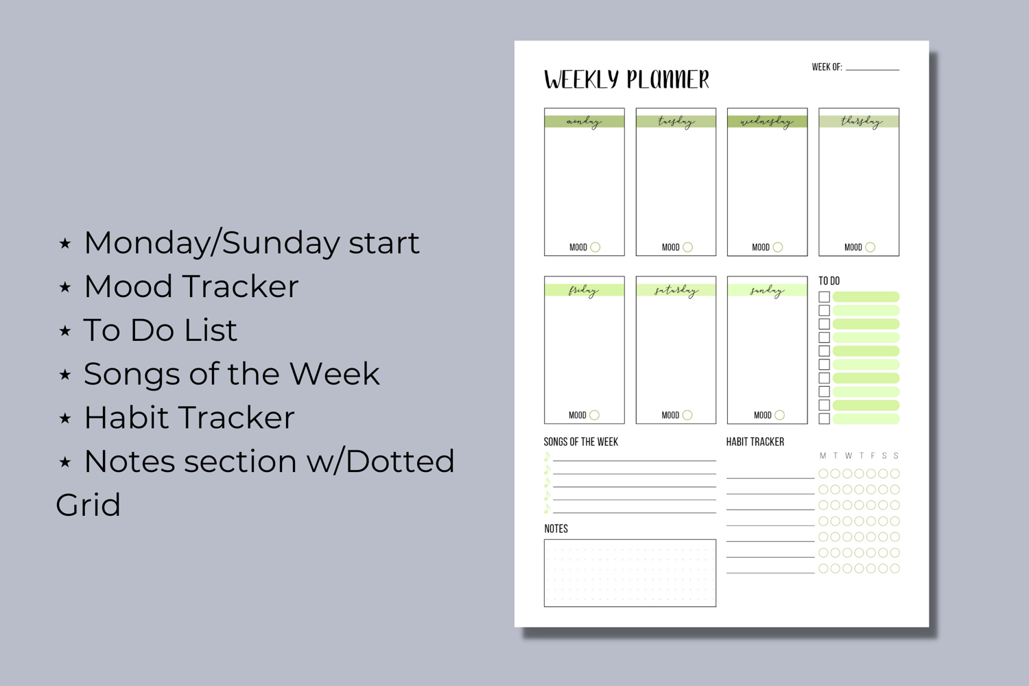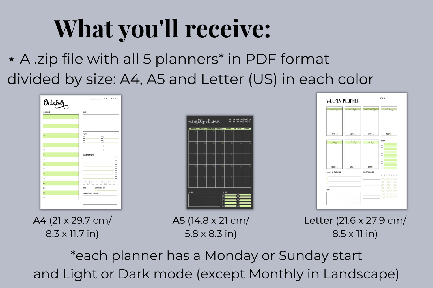 As this is a digital download, no physical product will be mailed to you. You'll receive one ZIP file containing the five planners in the color green in PDF files that include the following:
