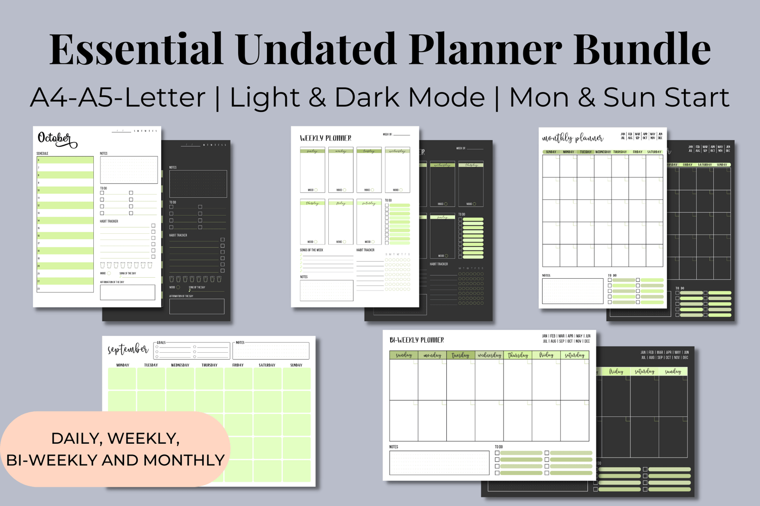 This bundle includes five planners: daily, weekly, bi-weekly and monthly, both in landscape and portrait mode. It’s the perfect bundle to mix and match throughout the year and match your daily life! 😊