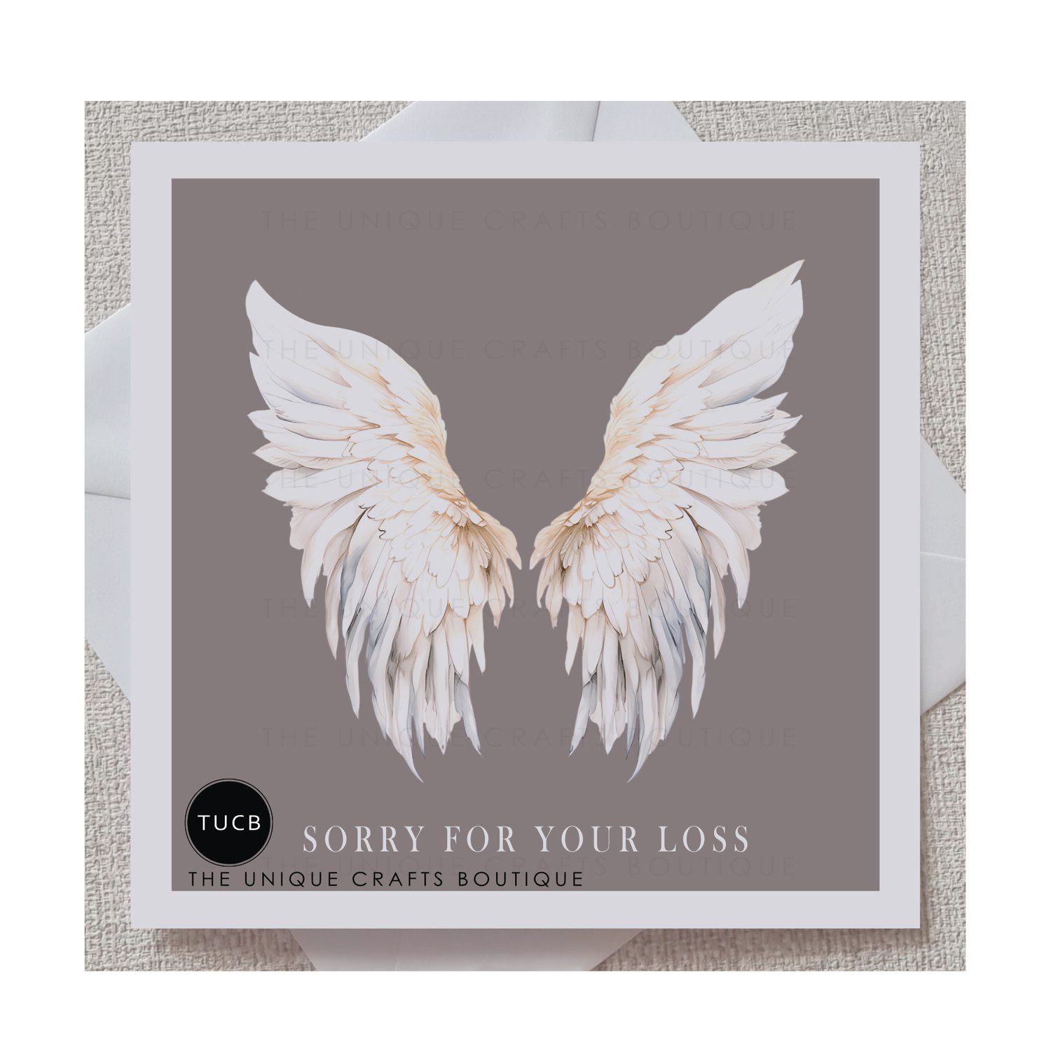 Printed with a delicate image of angel wings and displaying the message 'sorry for your loss'