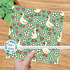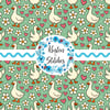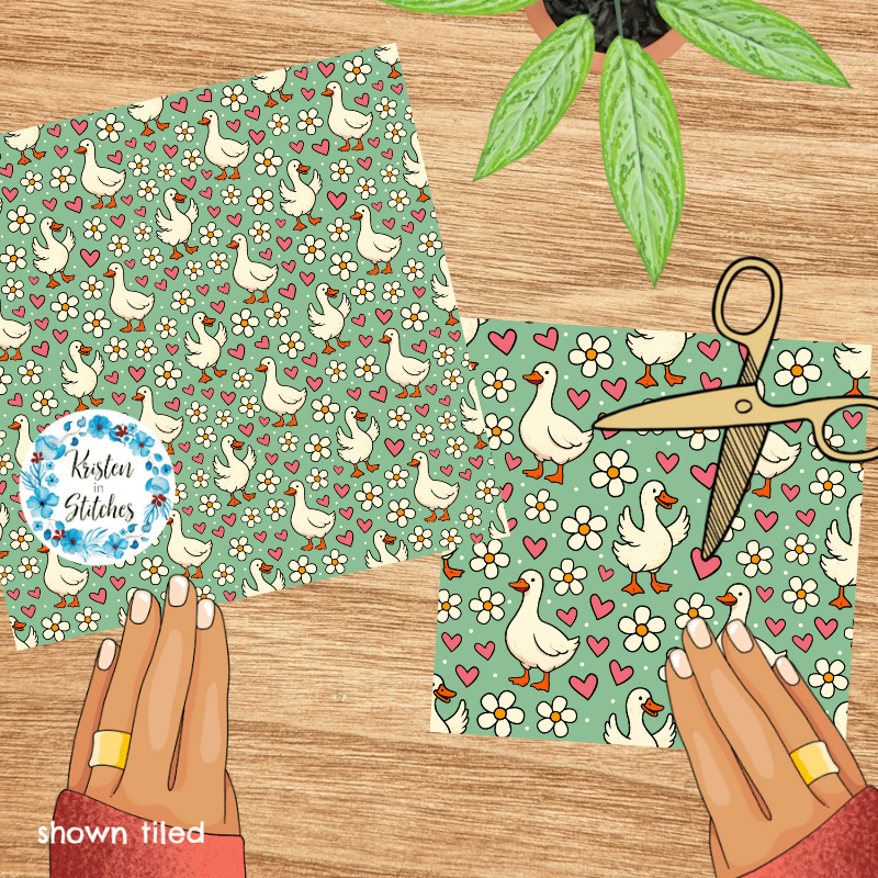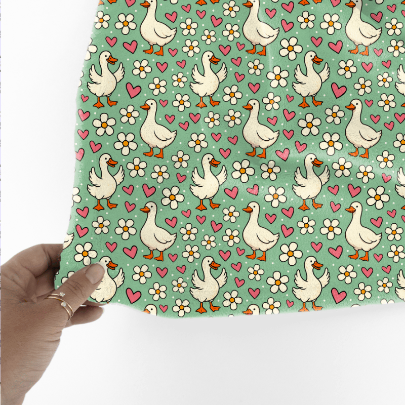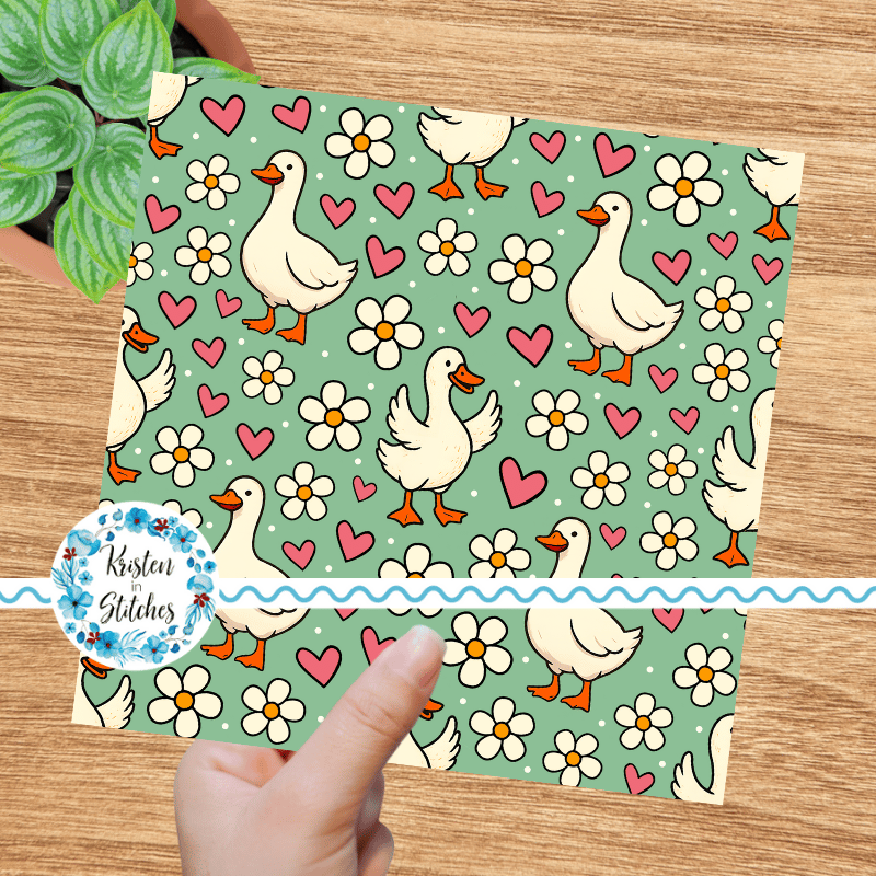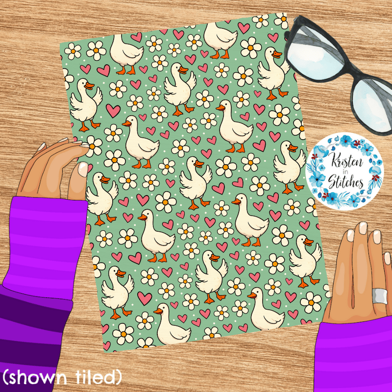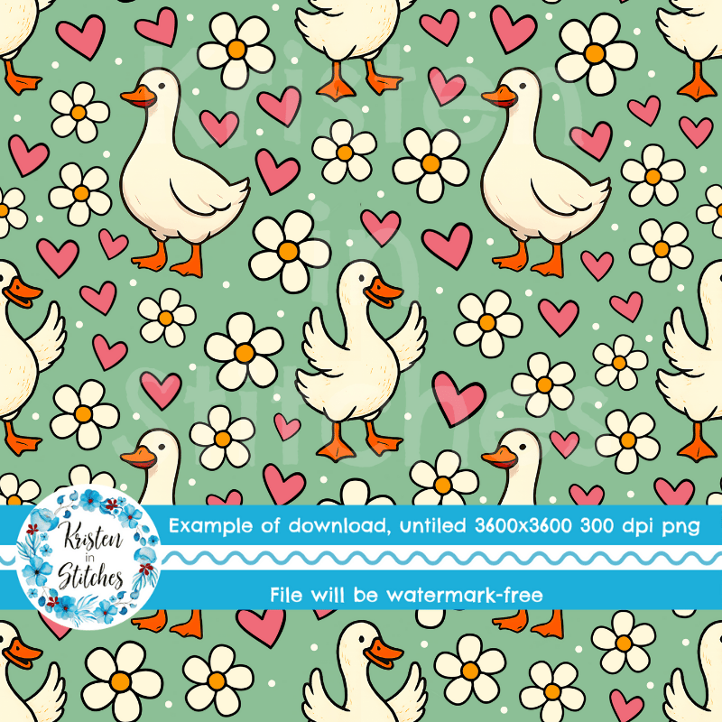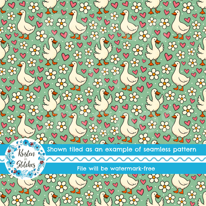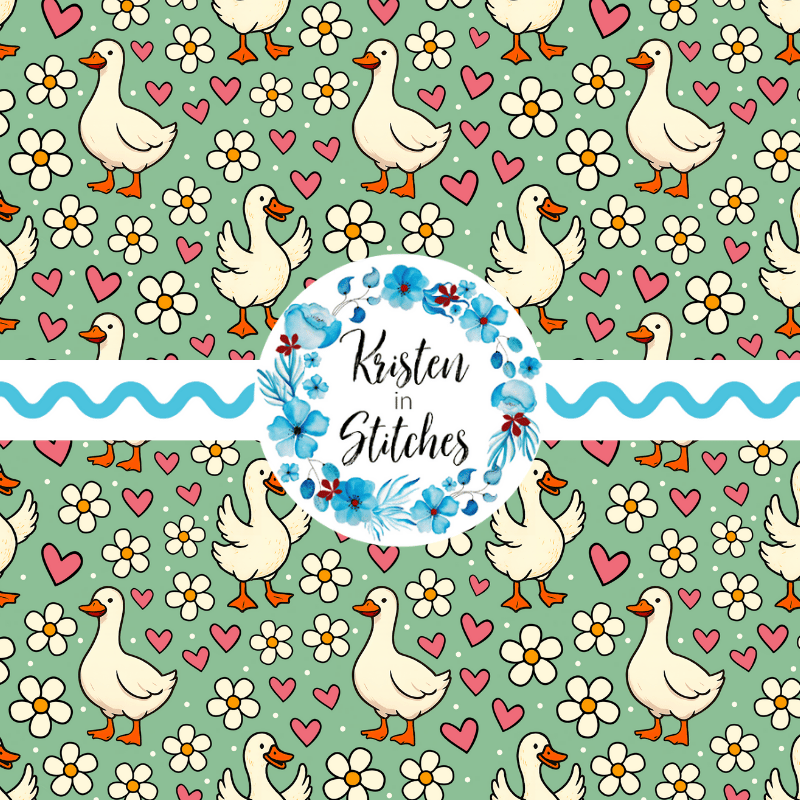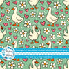 Spring Ducks Hearts and Daisy Flowers Seamless Pattern, Green