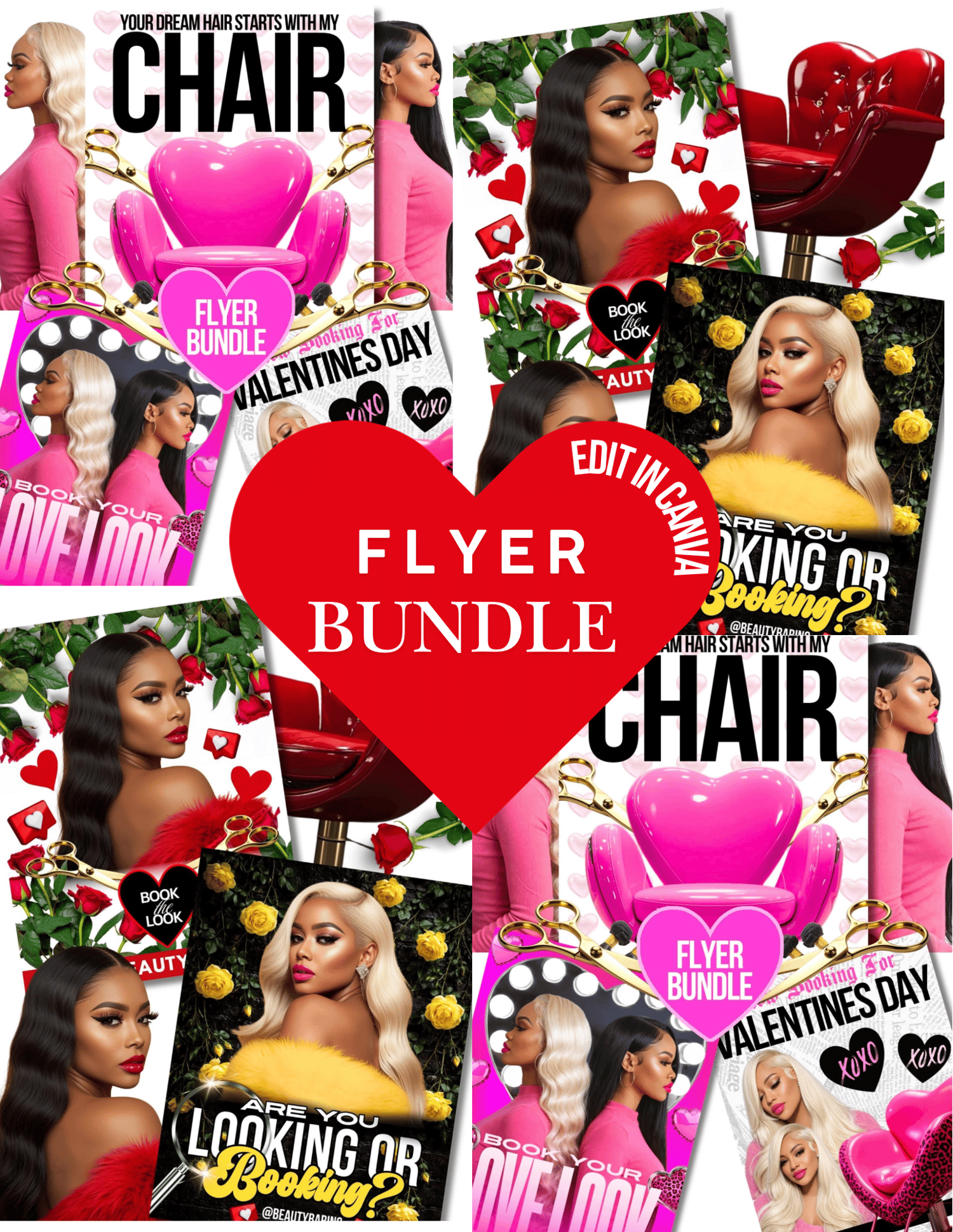 Each flyer is fully editable in Canva Pro, allowing you to customize text, photos, colors, pricing, and branding in minutes. Whether you’re promoting hairstyles, extensions, or Valentine booking specials, this bundle gives your business a polished, professional look perfect for digital marketing or print use.