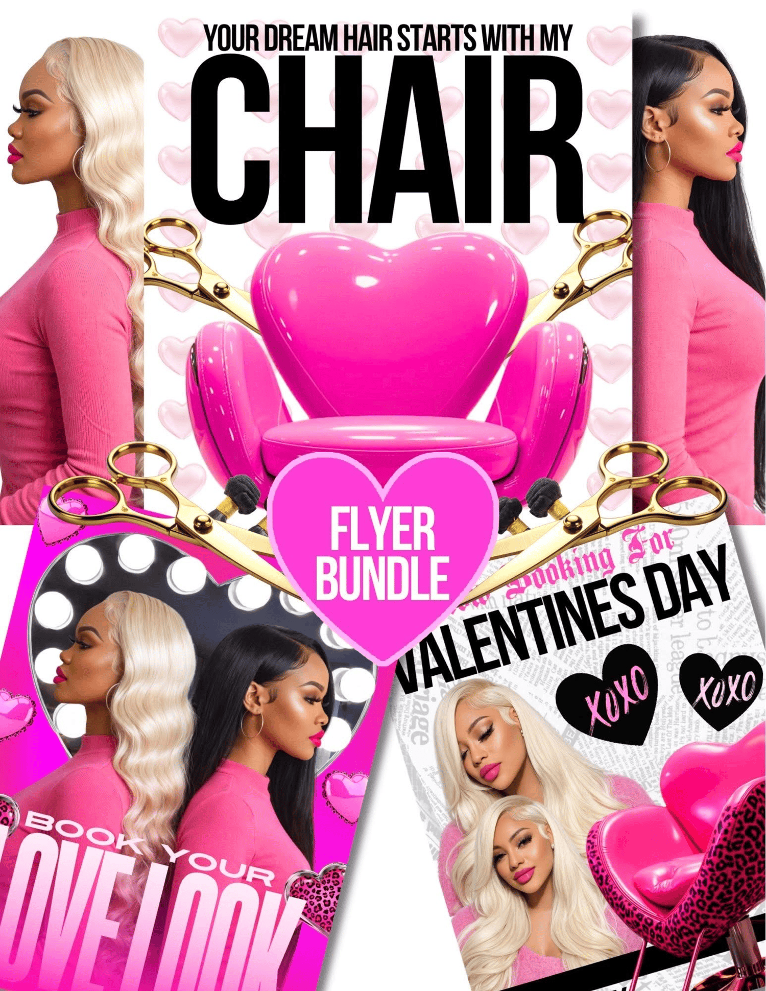 Make a bold statement this Valentines season with this high end Valentine Hair Flyer Bundle, featuring 6 luxury, glam flyer designs created specifically for beauty professionals. These eye catching layouts are designed to help you attract attention, promote Valentine’s specials, and increase bookings with ease.