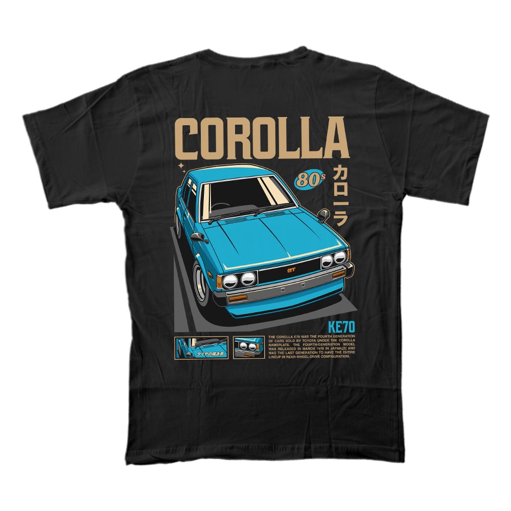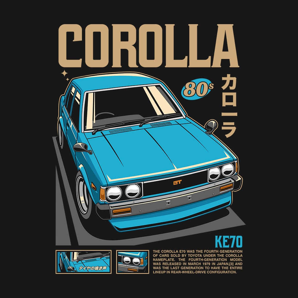"COROLLA KE70" is a retro design celebrating Toyota's legendary rear-wheel-drive E70 generation (1979-1983). With bold vintage typography, it captures the essence of this JDM classic that became a drift icon. Perfect for car enthusiasts as wall art, apparel, or stickers. High-resolution digital file included for versatile use.