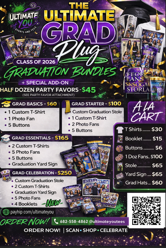 Each bundle can include a mix of custom t-shirts, graduation stoles, fans, buttons, party favors, keepsakes, and more, all personalized to match your graduate’s school colors, theme, and personality. Whether you’re celebrating one graduate or planning for a group, our bundles are perfect for creating a coordinated and unforgettable look.