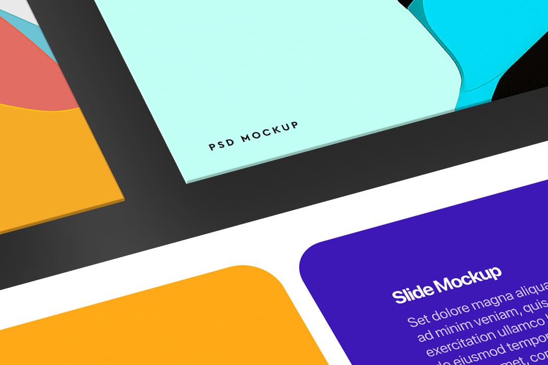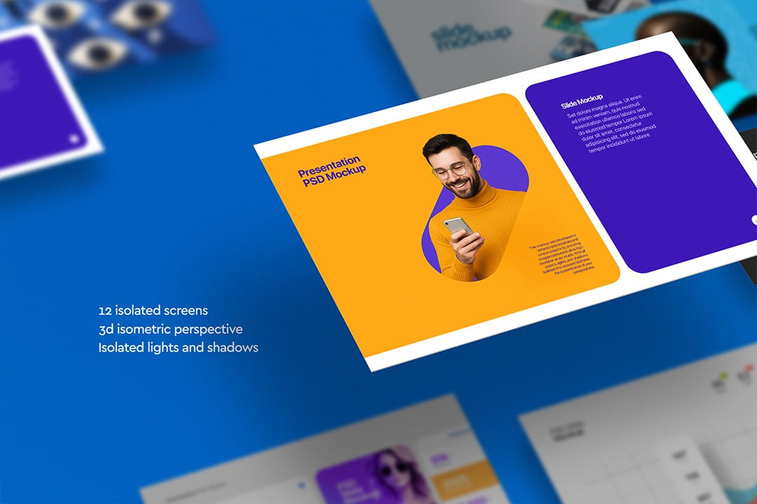 Photorealistic presentation-slides mockup pack with twelve masonry-grid screens, editable lights and shadows.