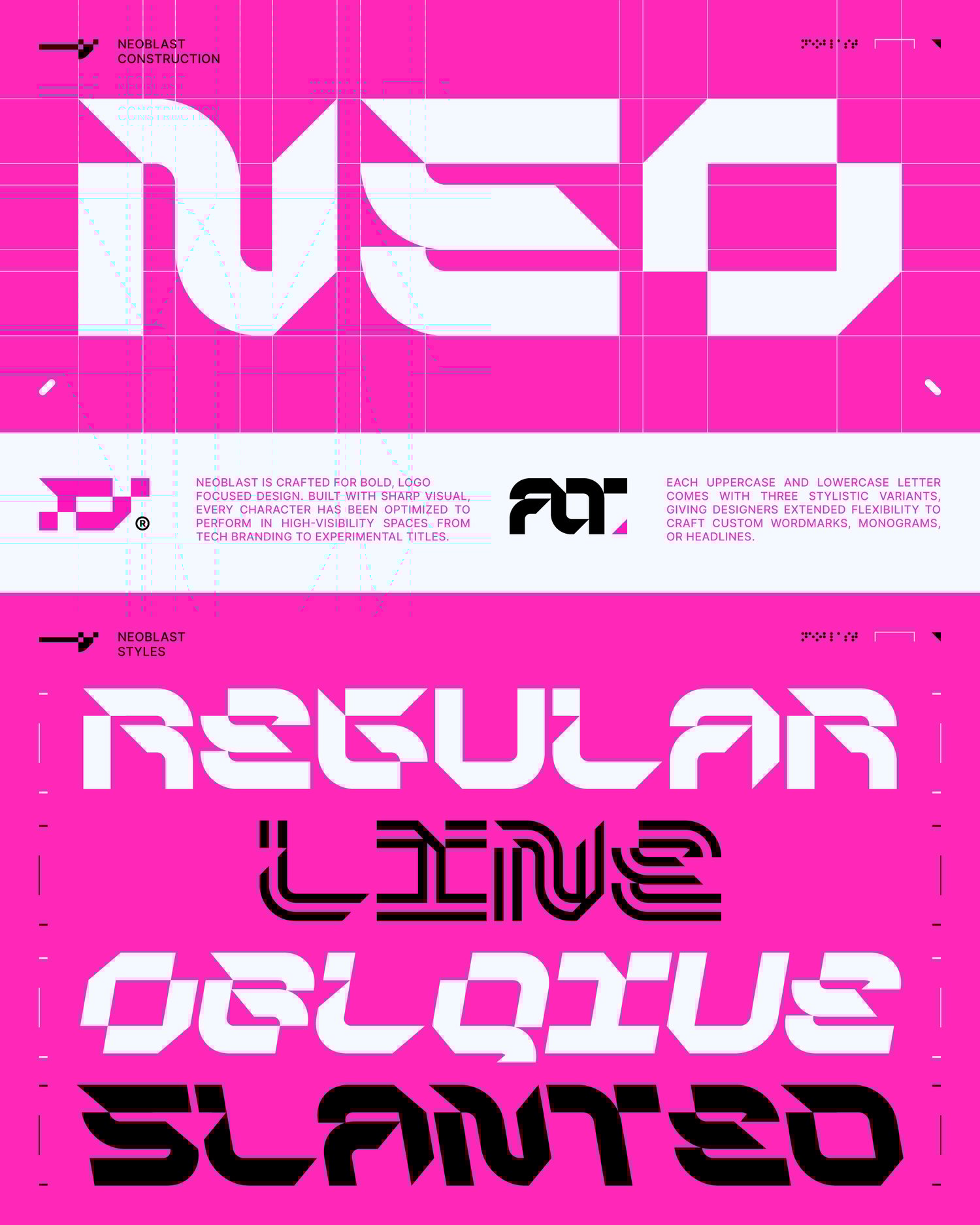 NeoBlast is a futuristic display font and optimized for logotype purpose. the letters are bold and has mixed of rounded and sharp edges. it has regular, line, oblique, and slanted styles. it's consist of uppercases, lowercases, numbers, symbols, and each letter has 3 alternative characters. it also can be used for poster design, tittle design, and many more~!