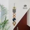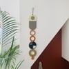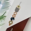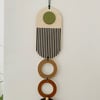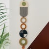 Handcrafted with care, this modern wall art piece features a blend of plywood, paint, metal, ceramics, waxed cord, and wooden beads. The color palette boasts a sophisticated mix of burnt orange, olive green, black, beige, and gold hues. This slender wall hanging serves as an exquisite addition, imparting a contemporary mid-century ambiance to any space. Crafted sustainably from plywood, it's meticulously hand-painted and assembled in Milton Keynes, England.