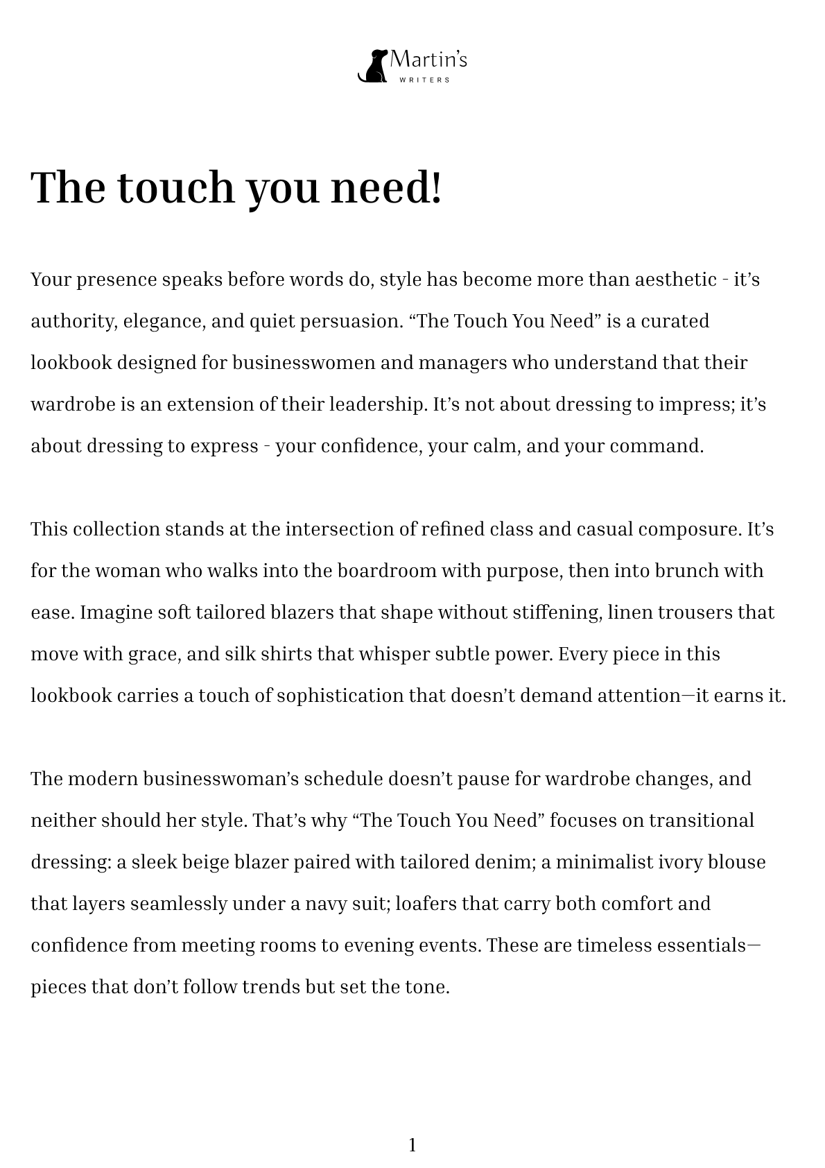 Your presence speaks before words do; style has become more than aesthetic - it’s authority, elegance, and quiet persuasion. “The Touch You Need” is a curated lookbook designed for businesswomen and managers who understand that their wardrobe is an extension of their leadership. It’s not about dressing to impress; it’s about dressing to express your confidence, your calm, and your command.