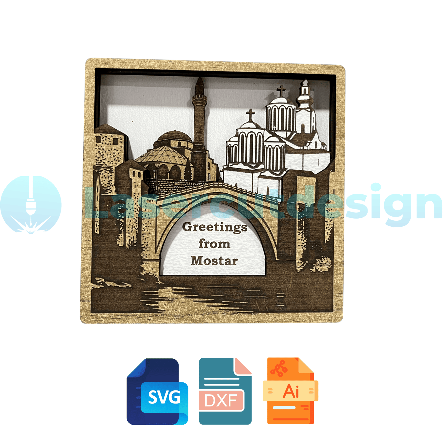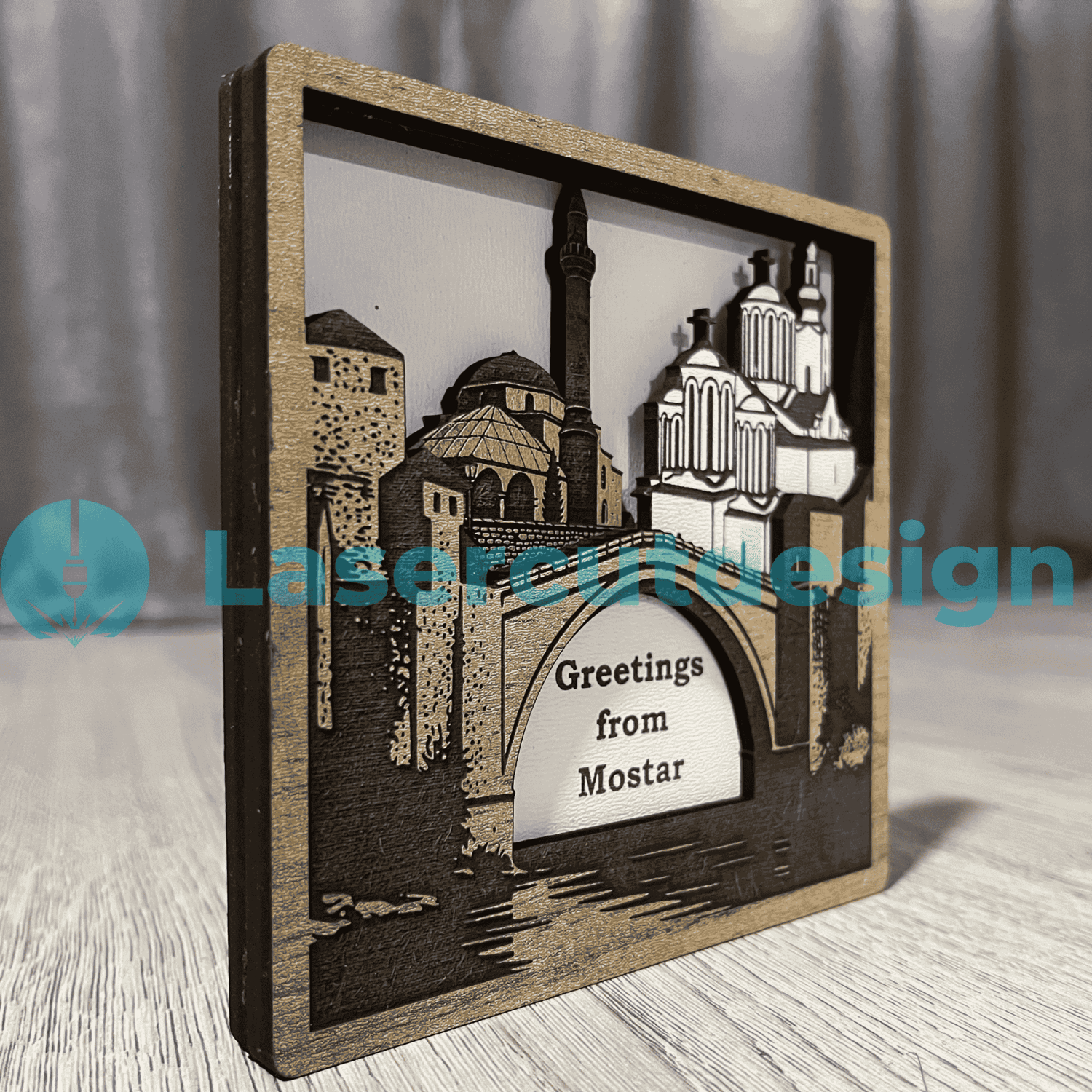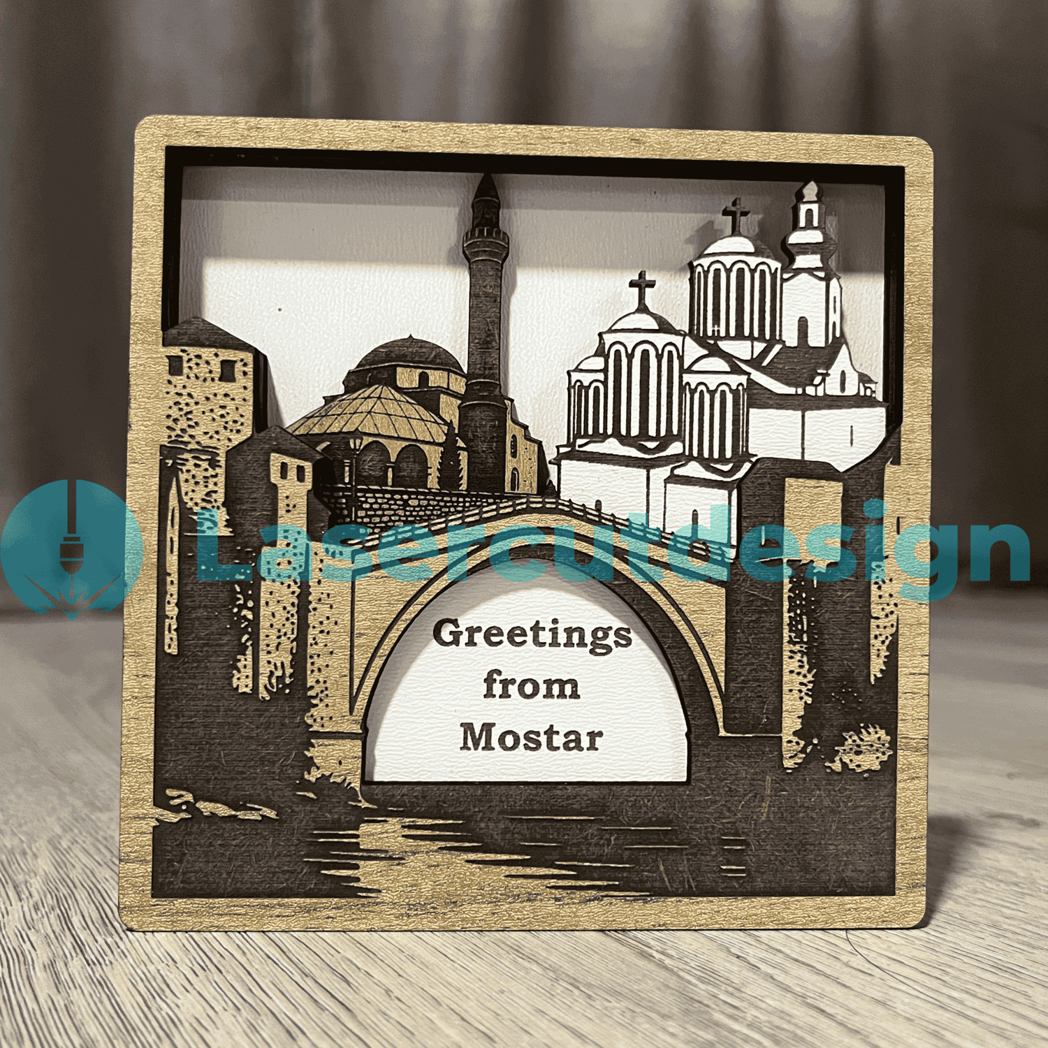 Greetings from Mostar 3D Wooden Souvenir – Bosnia Landmark SVG DXF AI Laser Cut File Layered