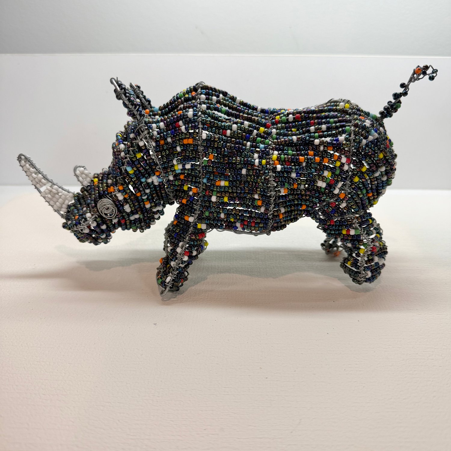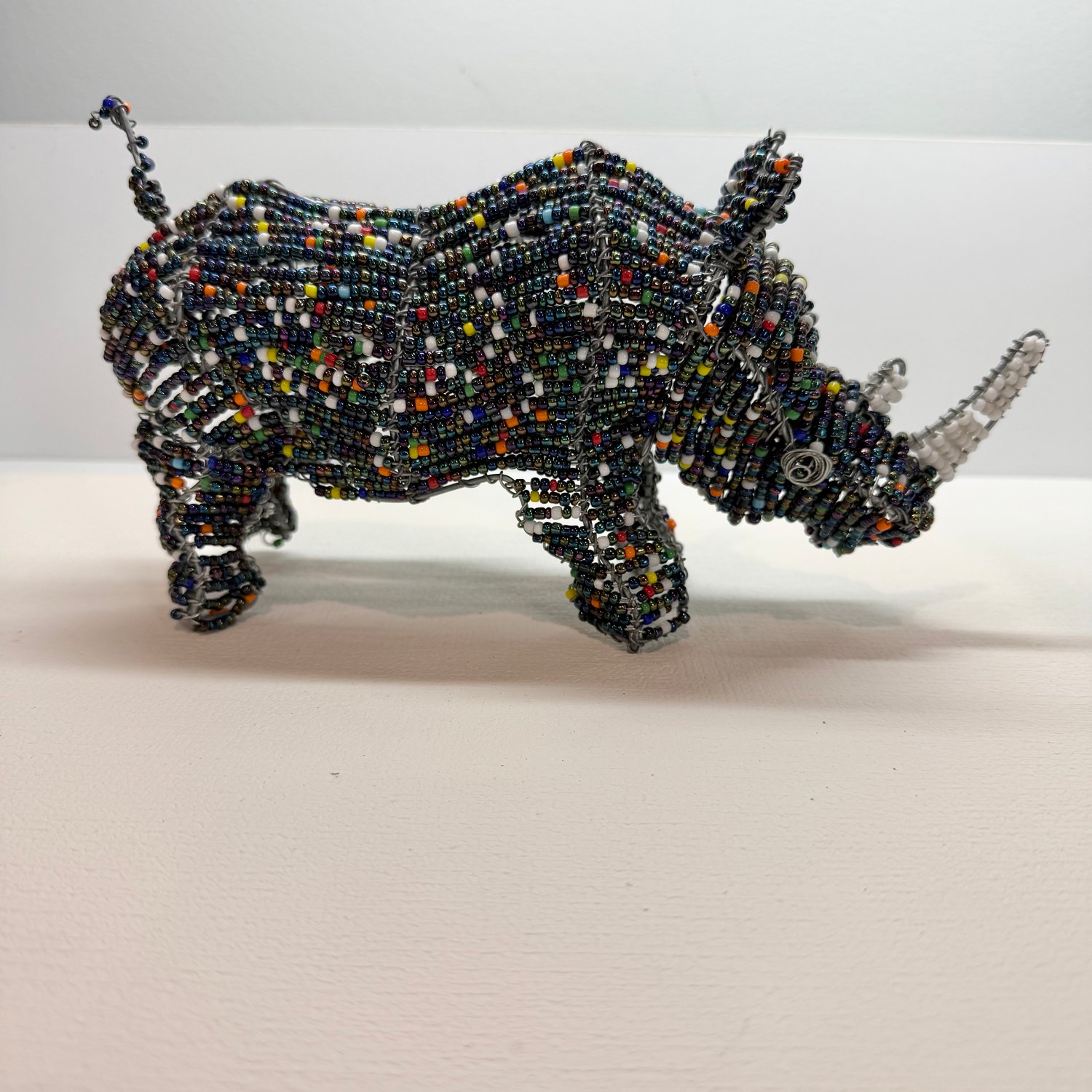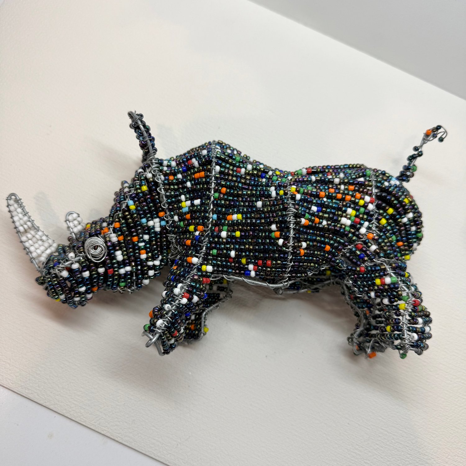 Handmade beaded Rhino statue. Made up of a metal frame, wire, iridescent “peacock” colored beads and other colorful beads.
