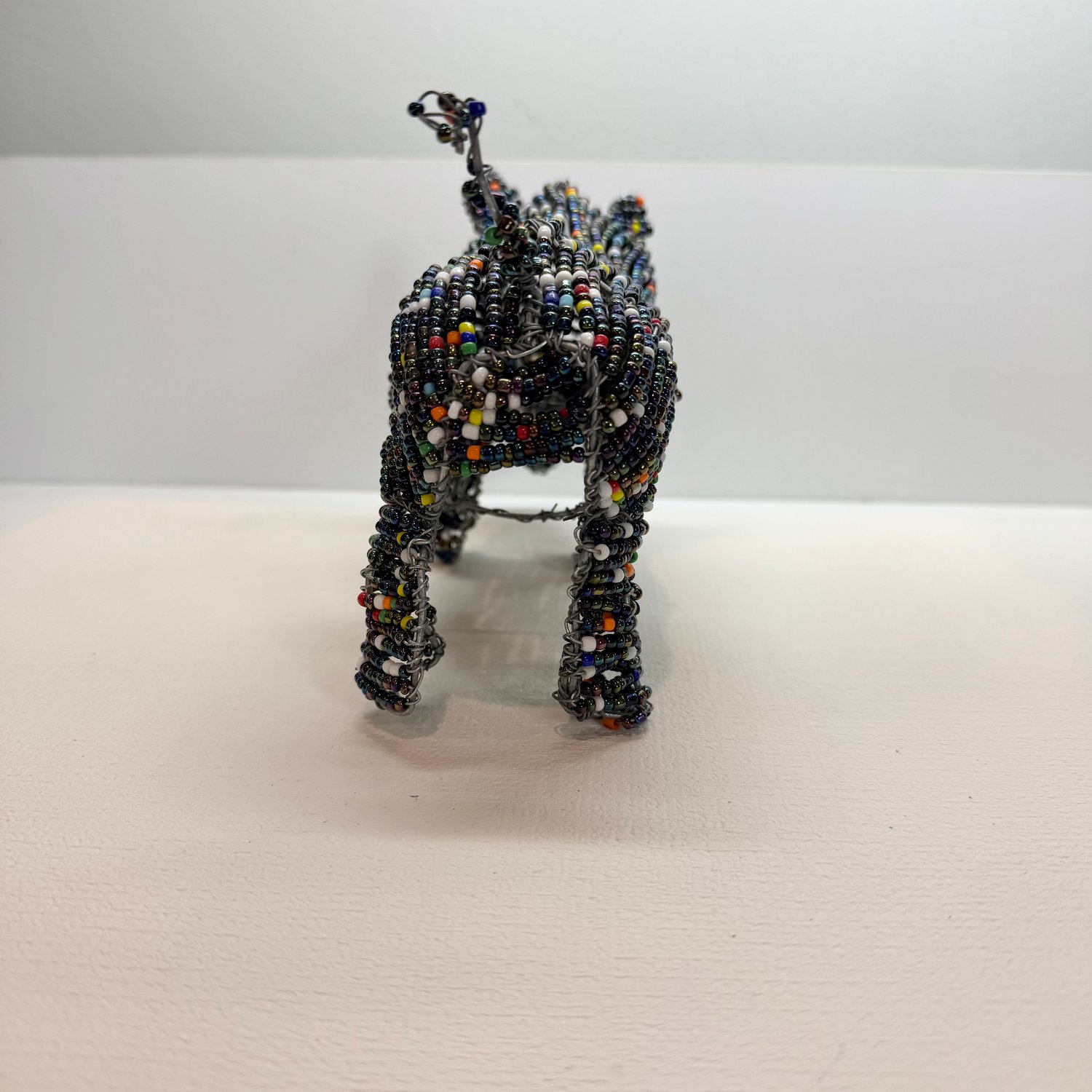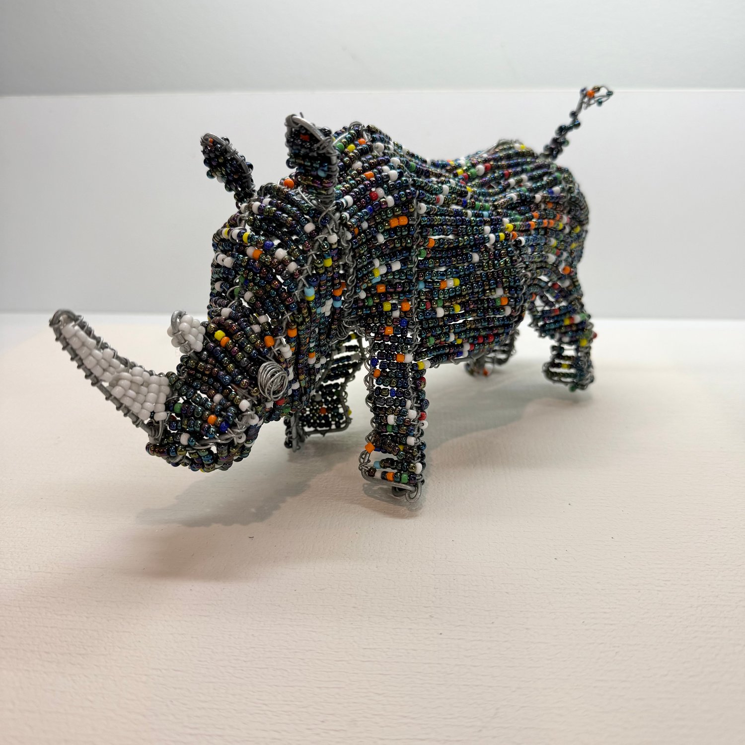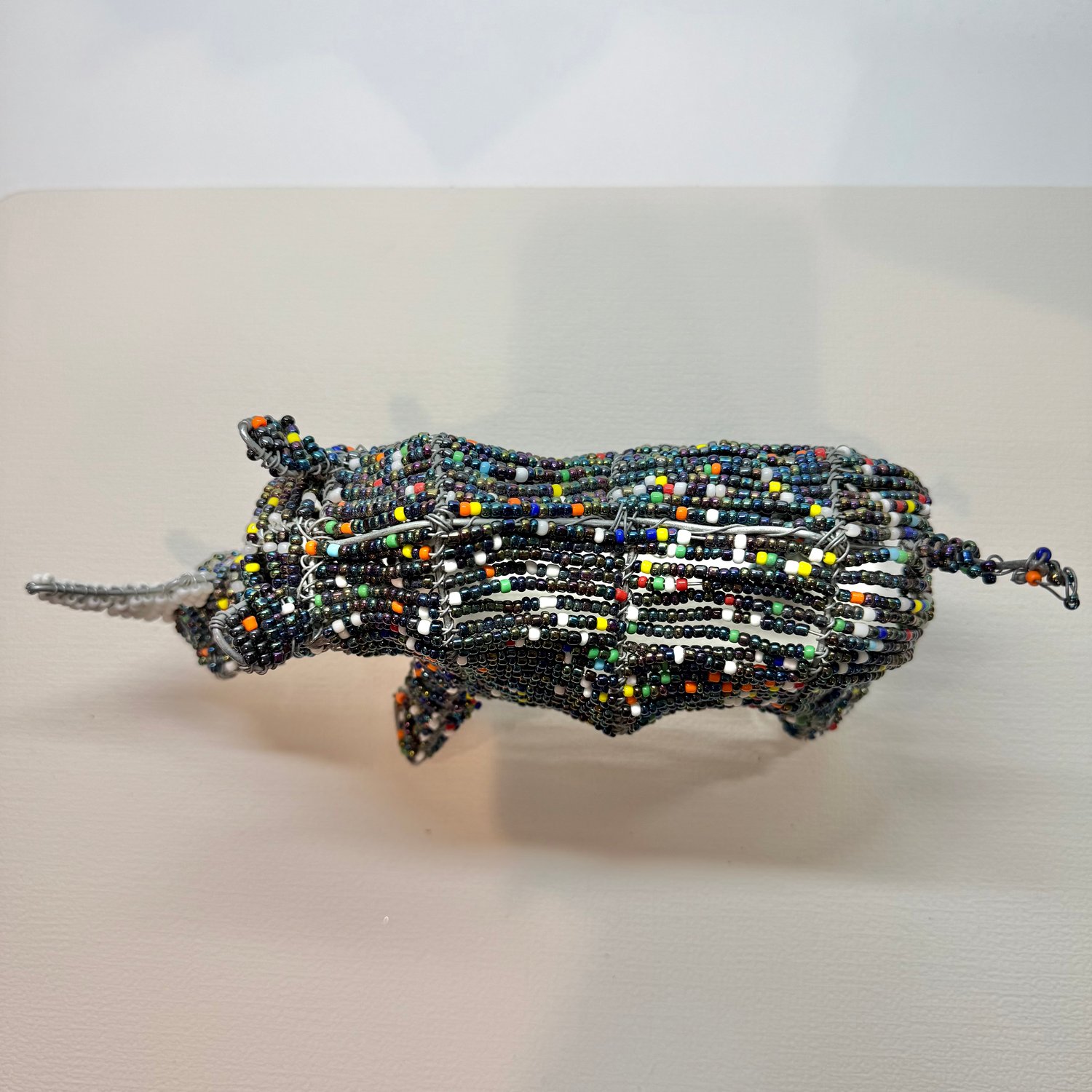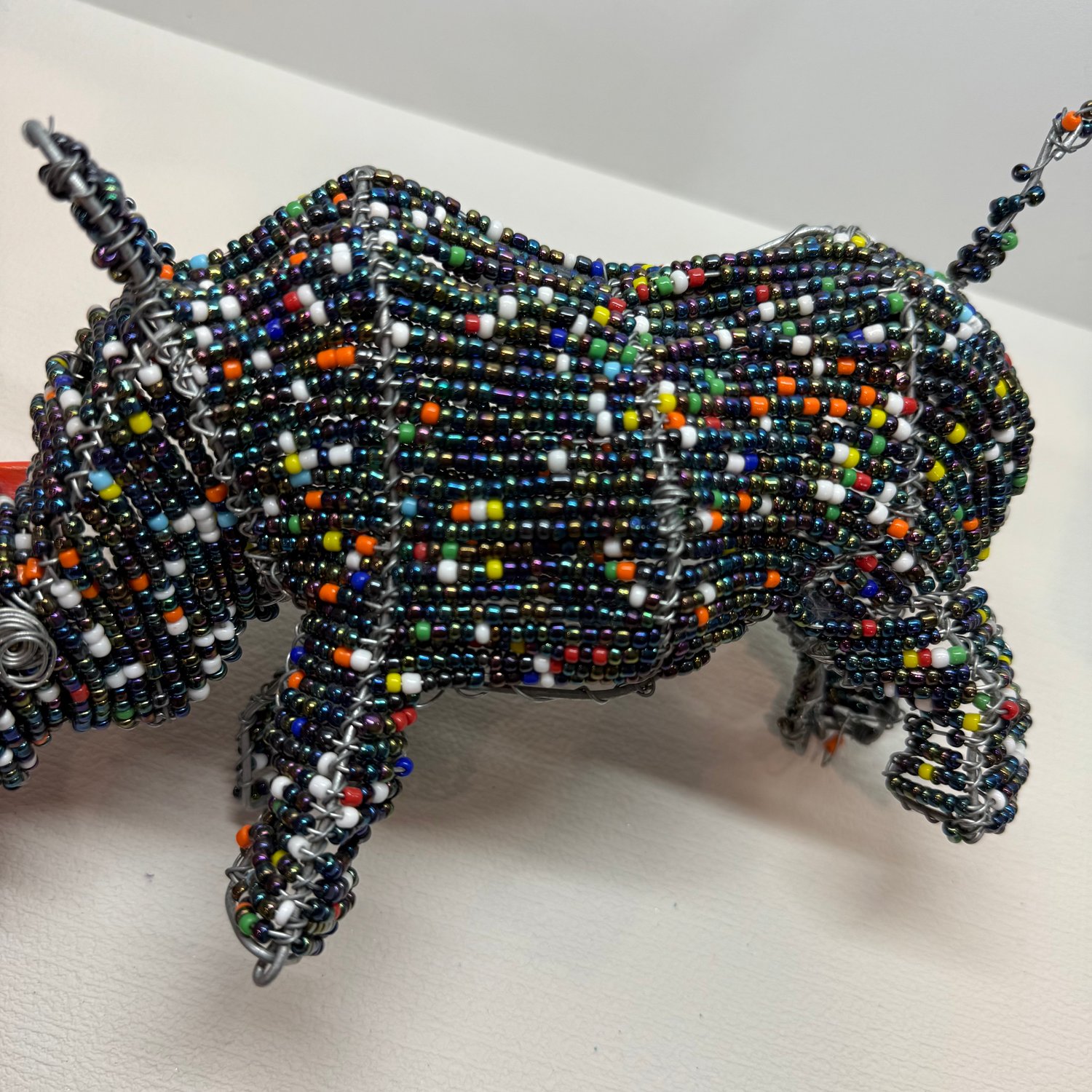 Handmade beaded Rhino statue. Made up of a metal frame, wire, iridescent “peacock” colored beads and other colorful beads.