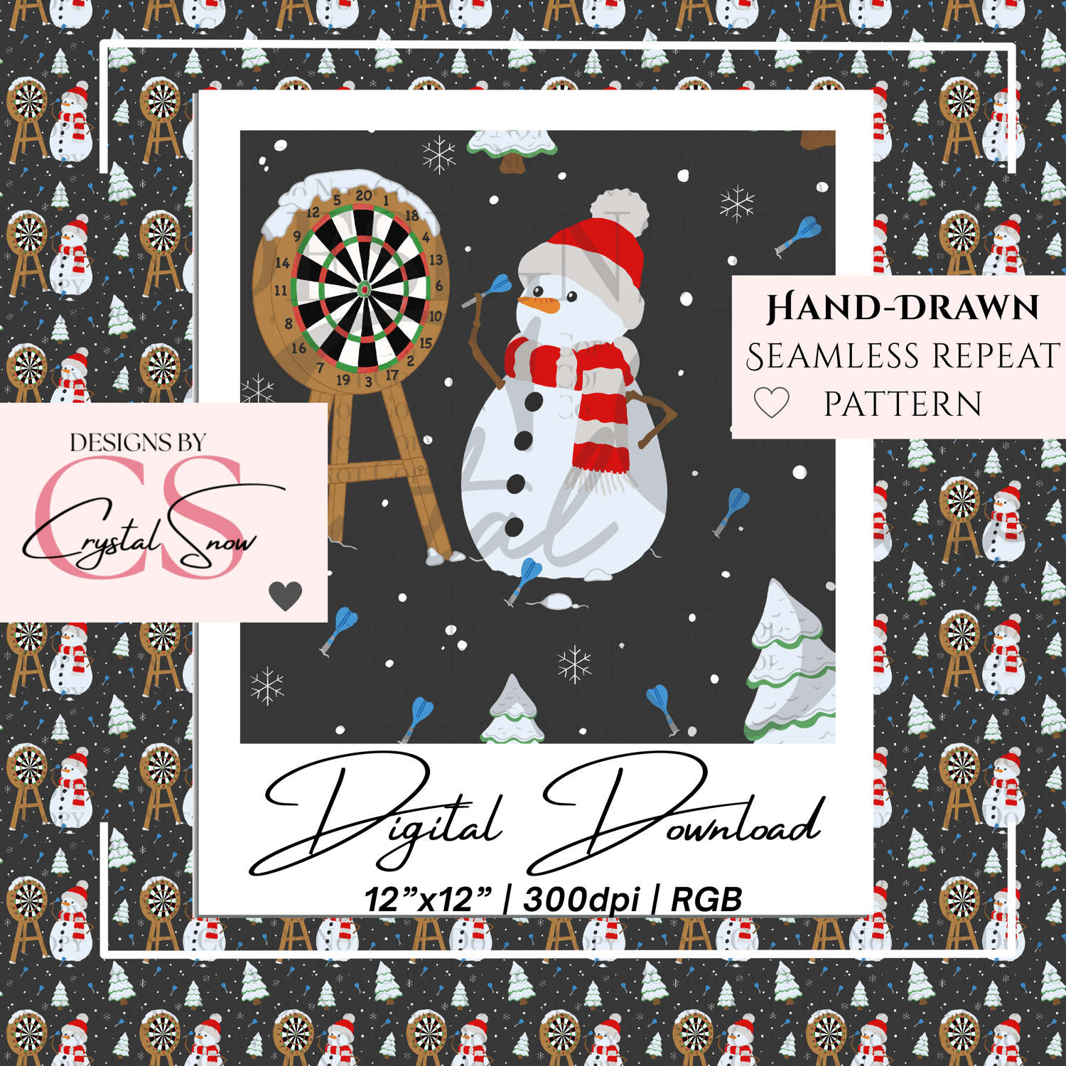 Bring a bit of humor and warmth to your Christmas projects with the Snowman Bullseye Seamless Pattern! Each element — from the dartboard to the frosty snowman in his cozy scarf — was hand-drawn with care and holiday spirit.