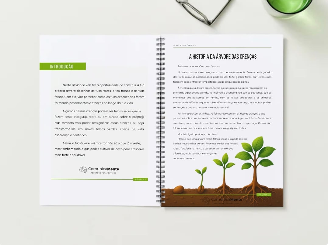 A atividade Árvore das Crenças é um recurso terapêutico estruturado em 17 páginas que utilizam a metáfora da árvore (raízes, tronco e folhas) para ajudar crianças e adolescentes a explorar as suas experiências de vida, compreender como estas moldaram os seus pensamentos e crenças, e aprender a ressignificar crenças negativas, desenvolvendo novas perspetivas mais funcionais e saudáveis.