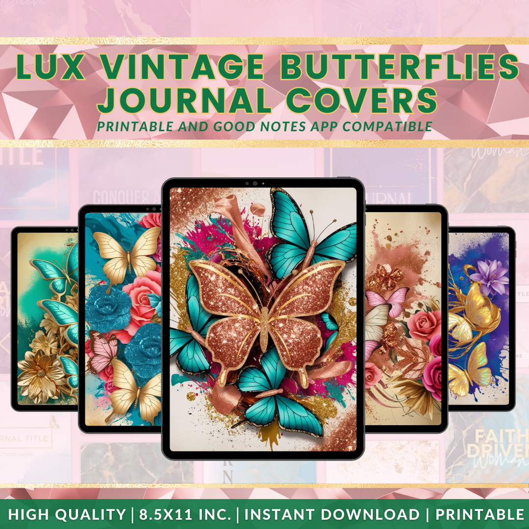 Immerse in creativity with our LUX VINTAGE BUTTERFLIES Journal Cover, designed for compatibility with the Goodnotes app. Fully editable and thoughtfully designed in an 8.5x11 in format, these covers seamlessly fuse artistic expression with practicality.