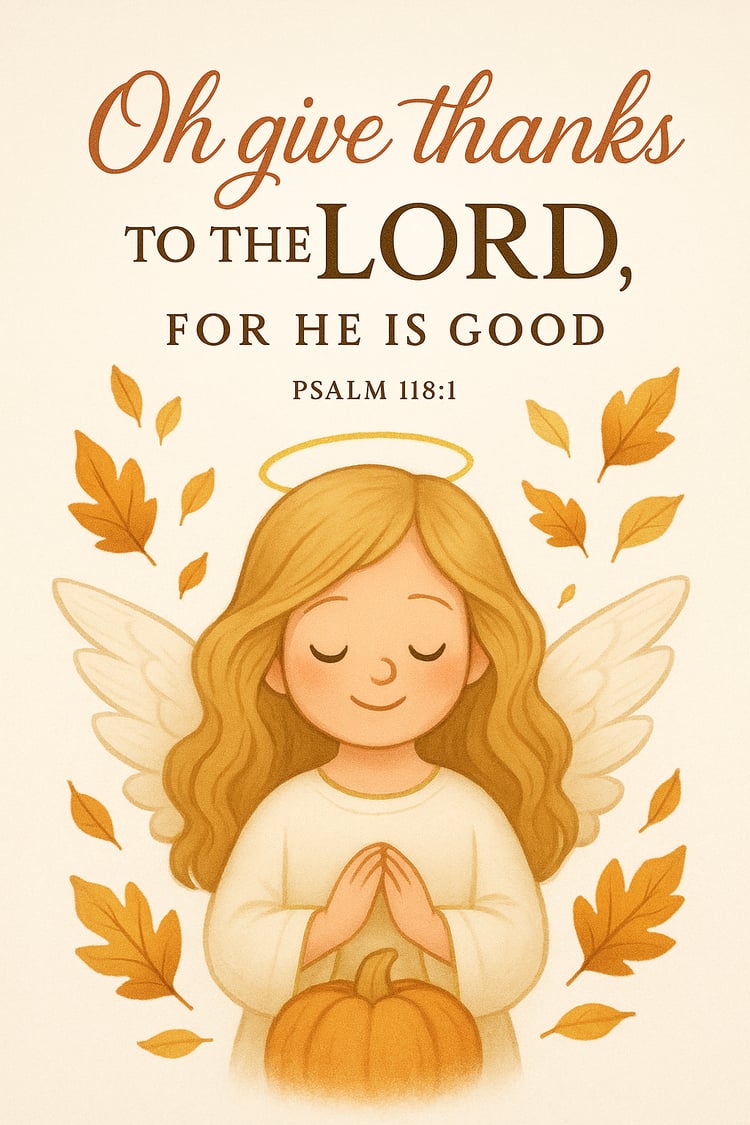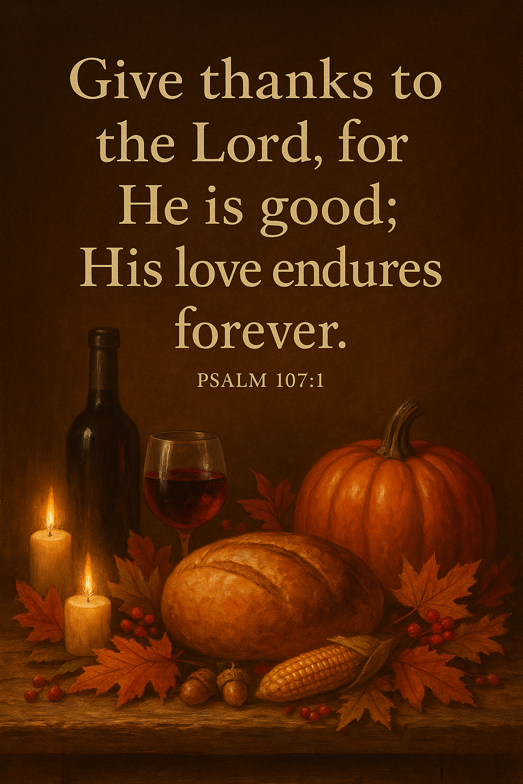 Celebrate gratitude and enduring love with this Give Thanks Scripture Poster, featuring a warm autumn still life of bread, pumpkin, corn, wine, and glowing candles. With rich textures and cozy tones, this printable brings emotional depth and spiritual reflection to any space β anchored in Psalm 107:1, itβs perfect for Thanksgiving bundles, homeschool walls, or ministry kits.