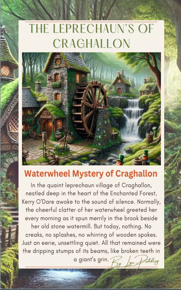 In the quaint leprechaun village of Craghallon, nestled deep in the heart of the Enchanted Forest, Kerry O'Dare awoke to the sound of silence. Normally, the cheerful clatter of her waterwheel greeted her every morning as it spun merrily in the brook beside her old stone watermill. But today, nothing. No creaks, no splashes, no whirring of wooden spokes. Just an eerie, unsettling quiet. All that remained were the dripping stumps of its beams, like broken teeth in a giant's grin.
