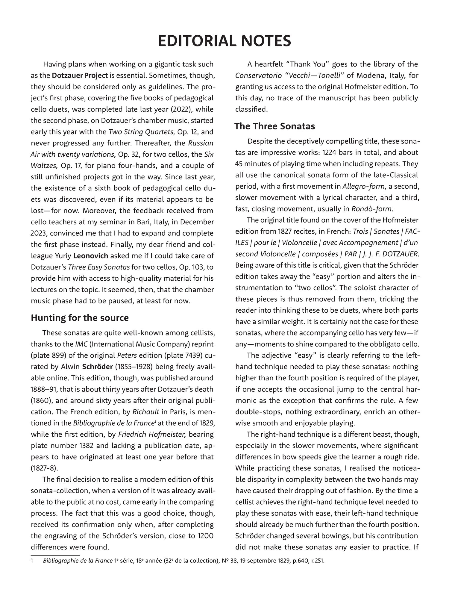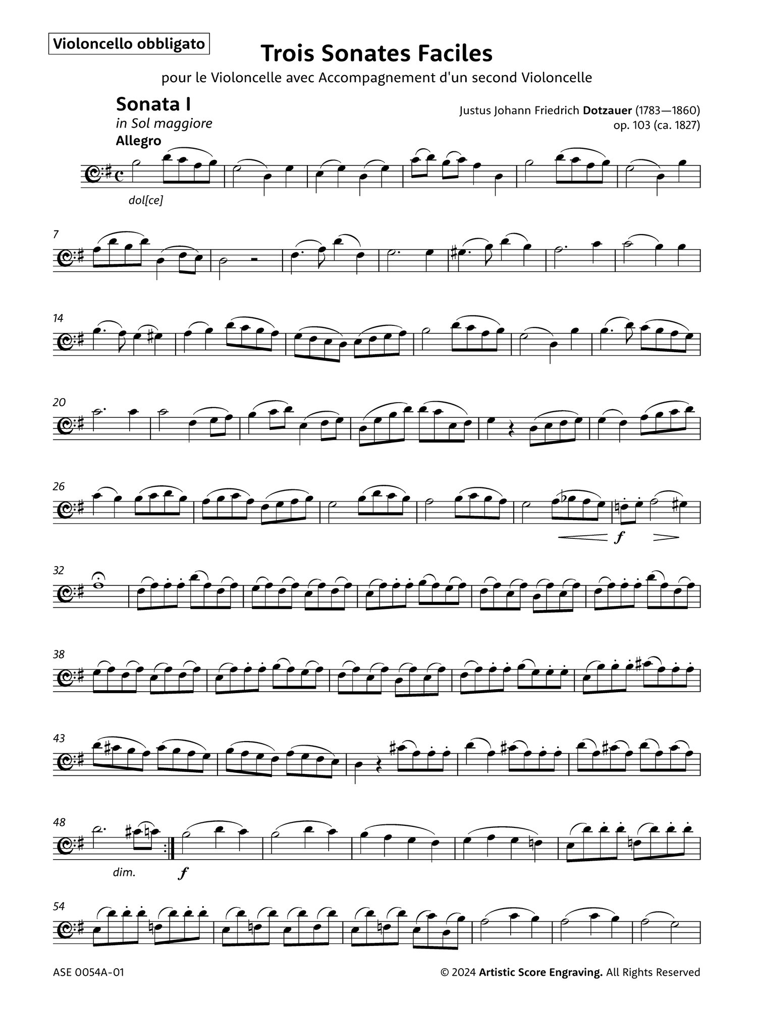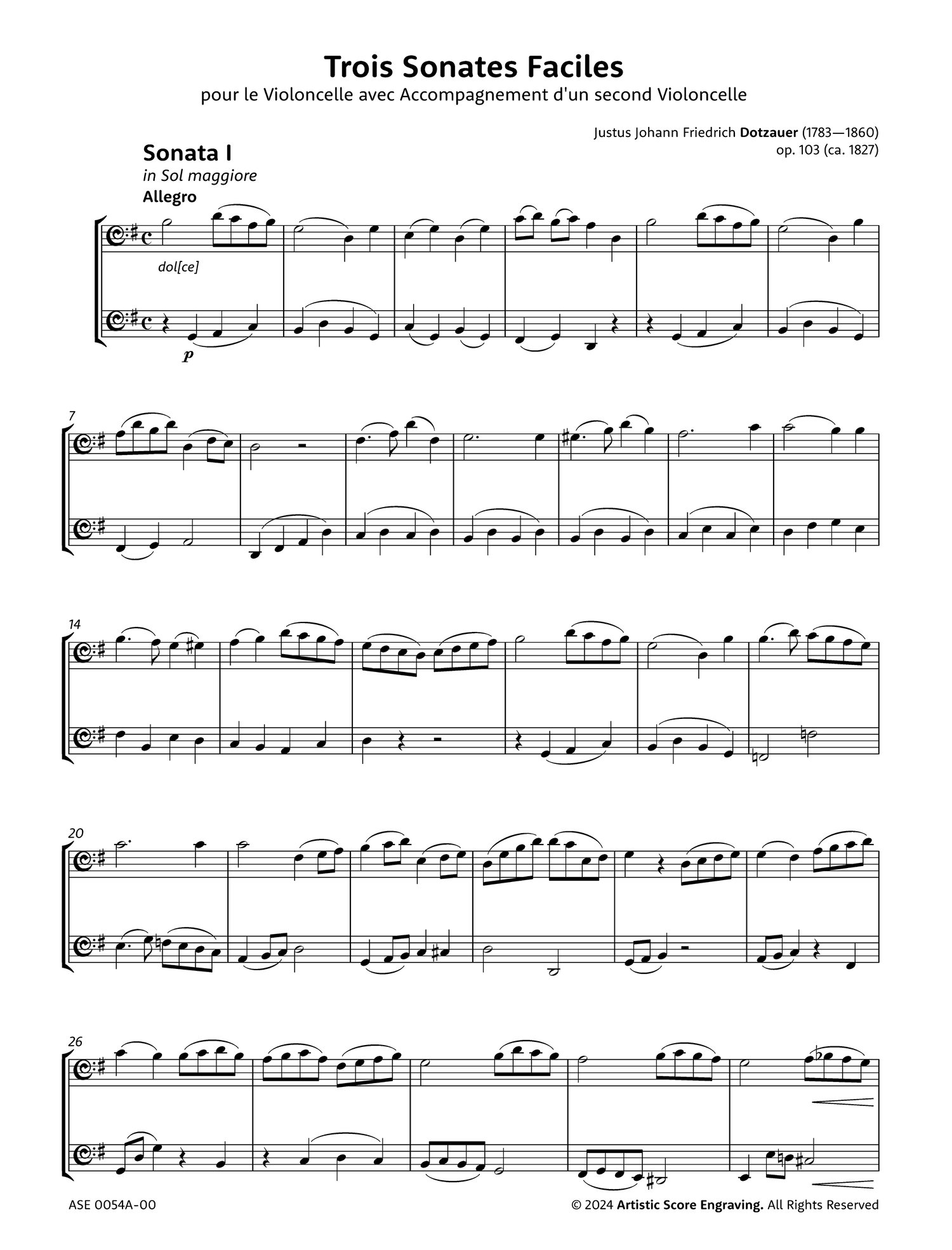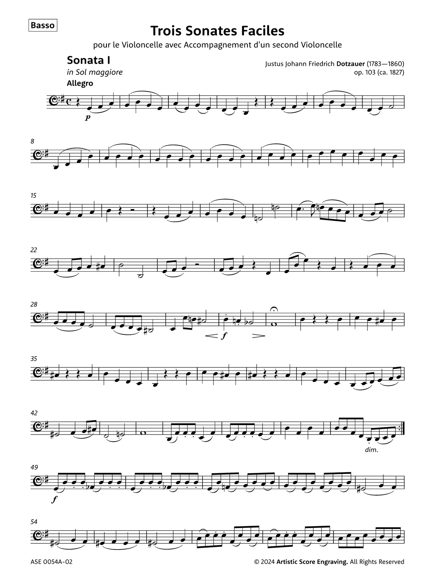 Justus Johann Friedrich Dotzauer (1783—1860) was a true man of his time, and progressively adapted to what the concert and educational market was after. This set of Three Easy Sonatas for Cello, accompanied by a second Cello, is the last one among his production and, as it already happened with other composers such as J. B. Bréval, it is the easiest one.