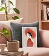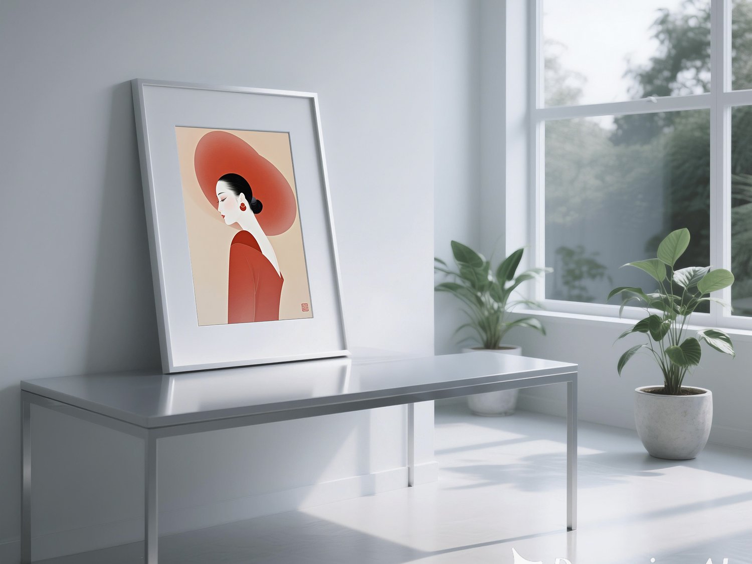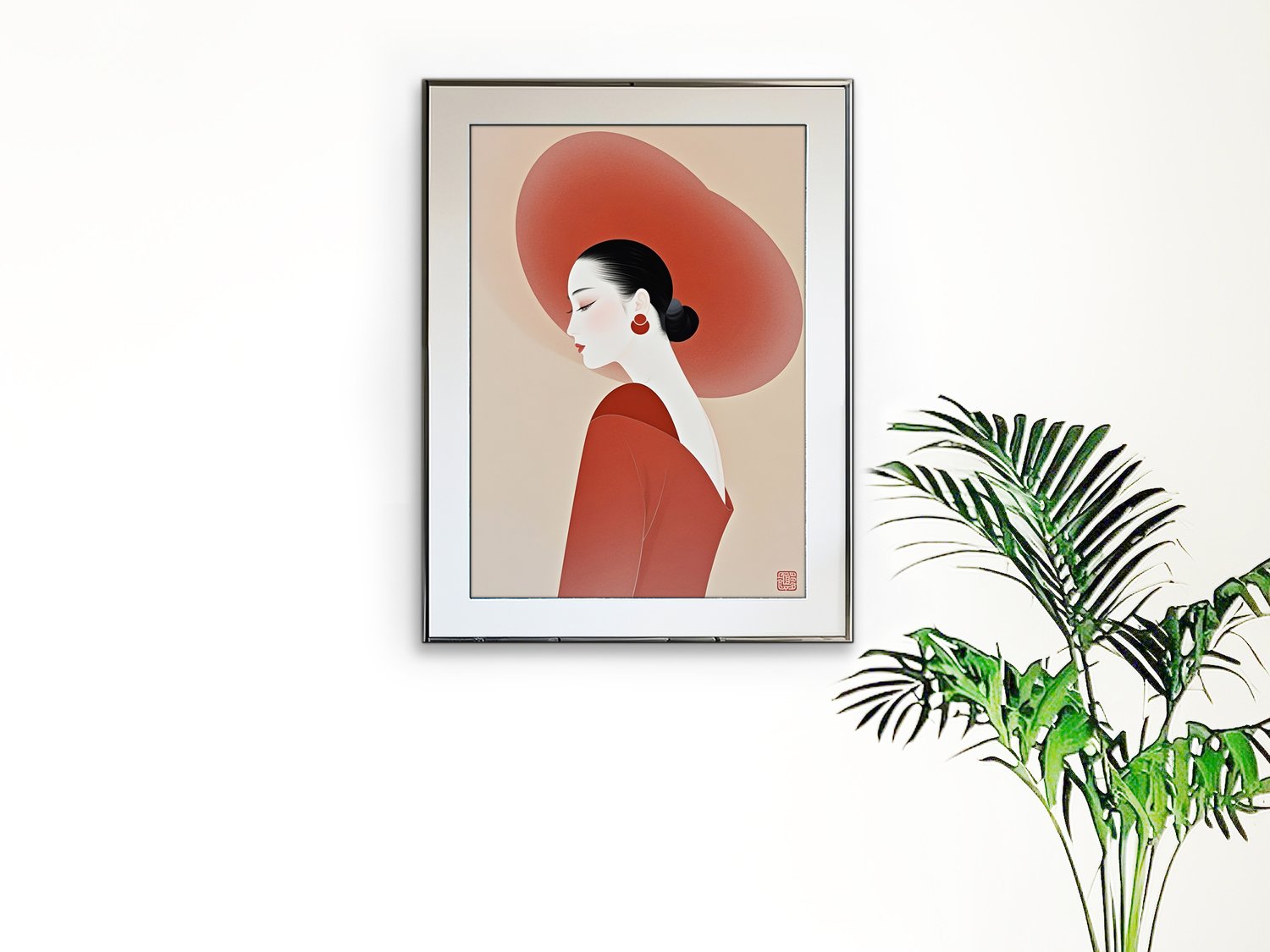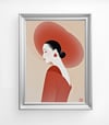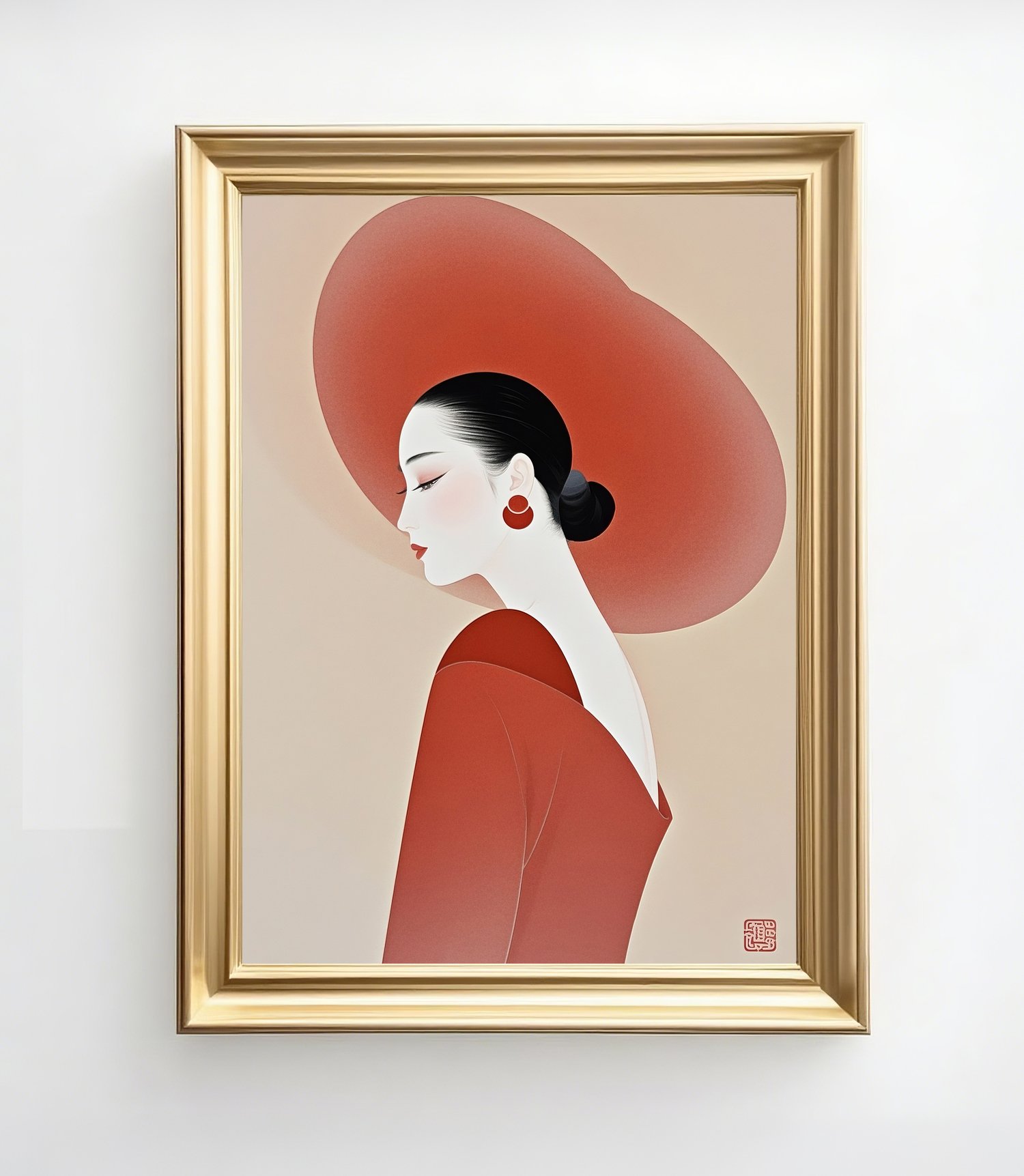 Elegant Minimalist Woman Portrait in Red Hat – Modern Asian Art Print uk028