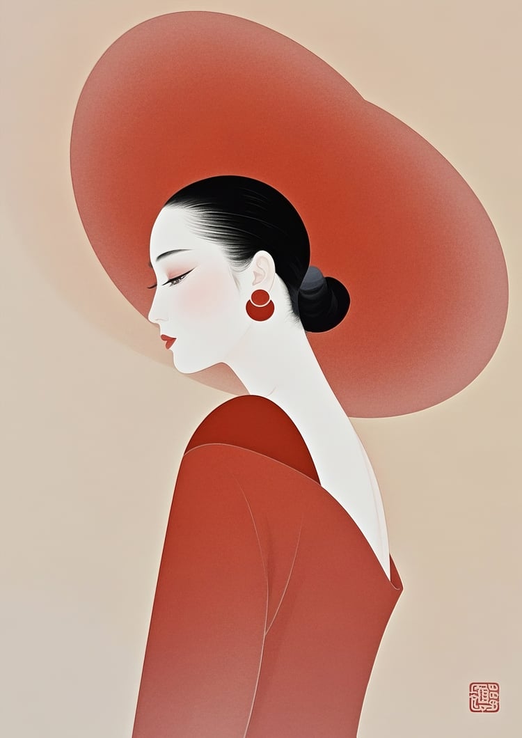The composition of this work combines smooth gradations and concise lines, giving the figure's profile a sense of serenity and elegance. The almost monotone color scheme based on red and beige gives a sense of unity and warmth to the entire work. Red symbolizes passion and confidence, and the beige background softens that intensity. The large hat arc and the flowing curve from the neck to the back create a beautiful balance. The impression of a sophisticated modern bijinga, which fuses elements of Japanese painting and modern illustration. Although it is digital, the expression that makes you feel the softness of the brushwork is attractive.