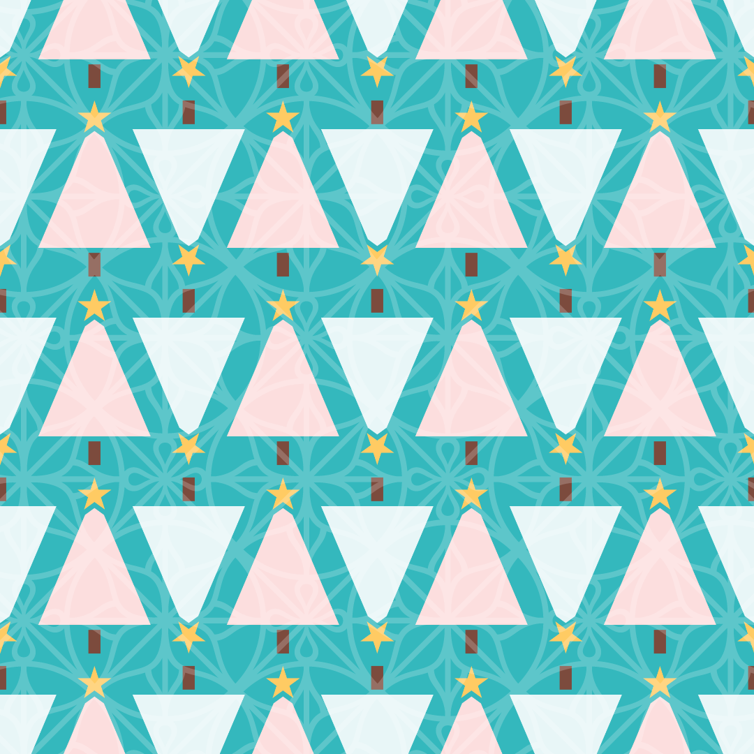 Seamless vector pattern of geometric Christmas trees created with simple triangles, rectangles and star shape.