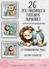 🌟 26 adorable lions with zoo animal friends, all letters of the alphabet. Each letter is different. A to Z. PNGs, sublimation, print, DTF. Instant download.