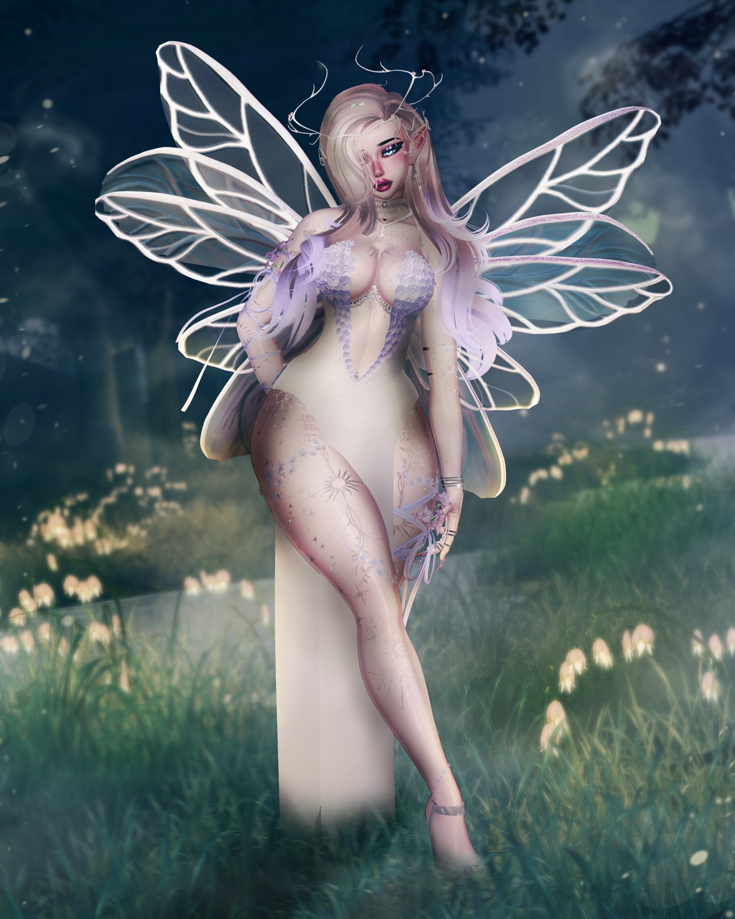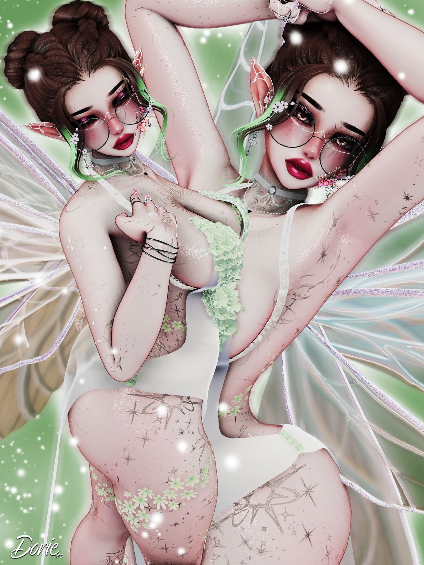 Body (Edit by me no reuse), Face (Edit by me no reuse),Butterflies, Hairs 1 2, Tats, Wildflower set bodyflowers elf decoration, Wings, Nails and staff, eyeshadow, Bow top and pearl necklace, Skirt sweater, Heels corset, Heels2 1 2, particles, Flower particle, Dress, Eye texture,