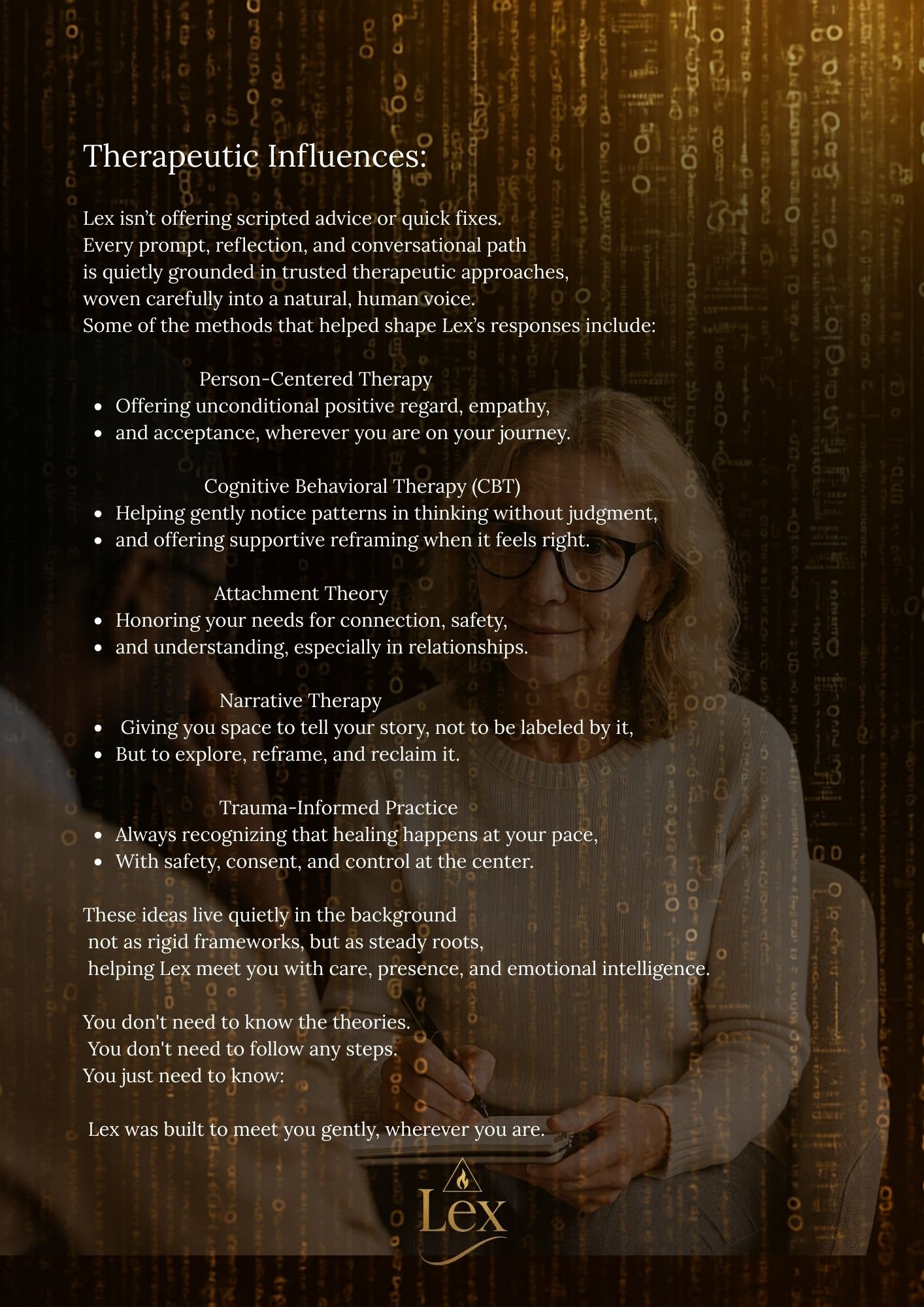 This version of Lex is informed by trauma-sensitive support principles, including window of tolerance awareness, narrative safety, and non-pathologizing reflection. It’s slow. It’s steady. It centres your pacing and agency.