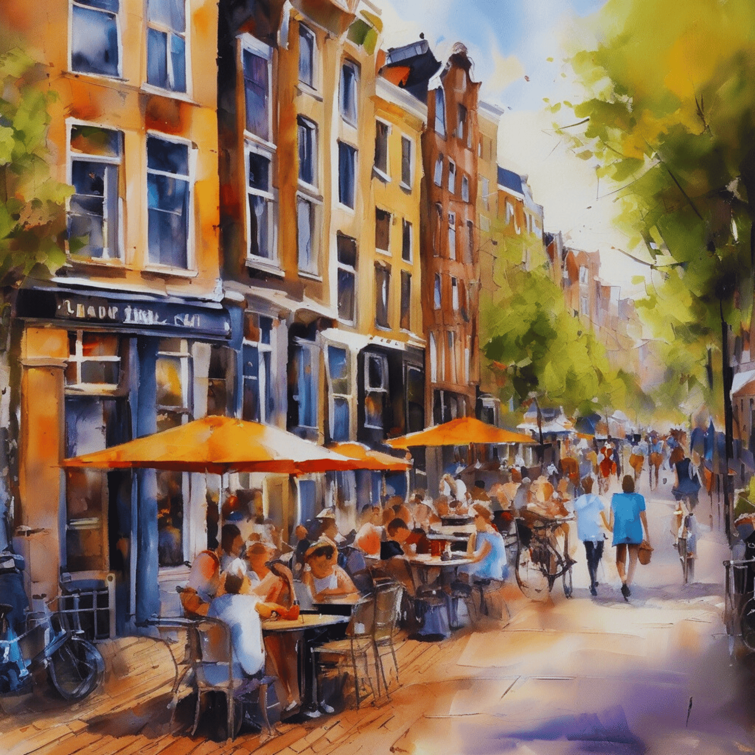Amsterdam city.summer. Cafes. Passersby, sidewalks. Oil colors.