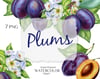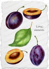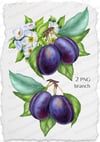 Juicy plums. Fruits elements with leaves, branches and flowers
