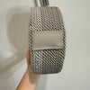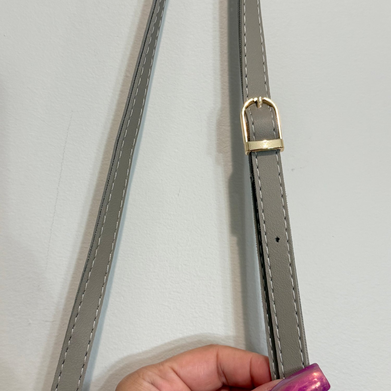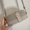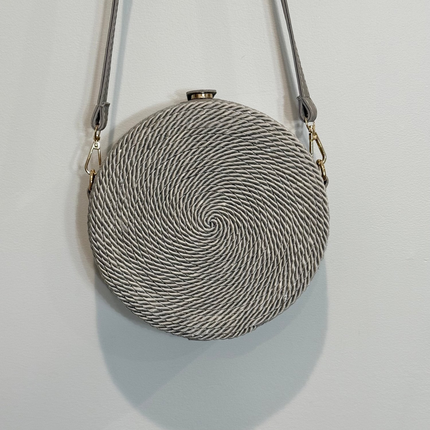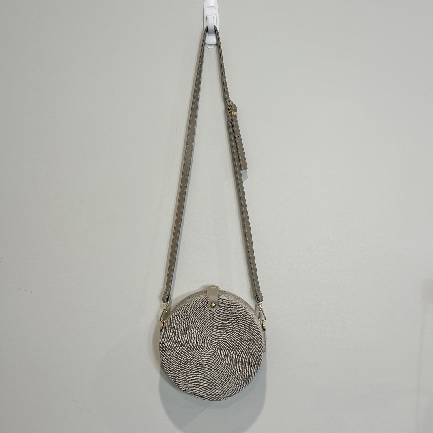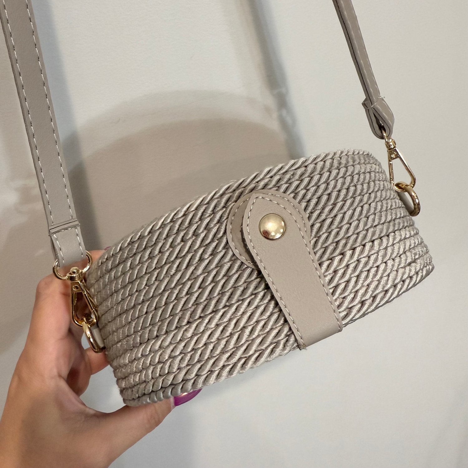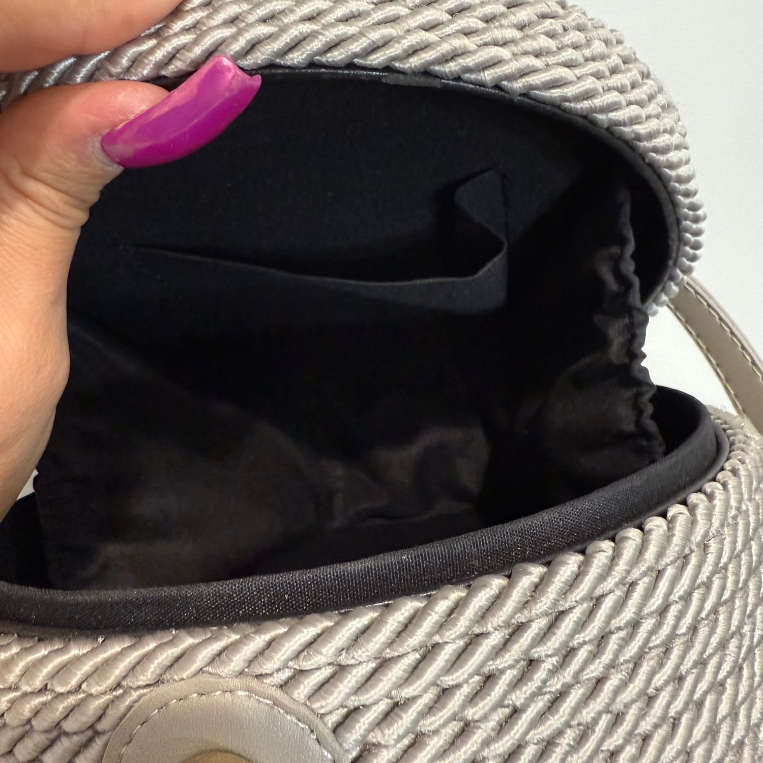 Unbranded gray rope and faux leather canteen style crossbody purse with gold tone hardware. Magnet snap closure opens to one compartment with a single slip pocket against one wall. Faux leather strap is adjustable and removable and a candidate for a chain strap extender if needed, they can be found here in the shop.