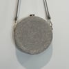 Approx measurements: 8” diameter x 3” wide and a 20” adjustable strap drop.