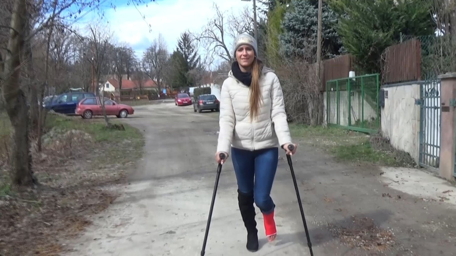 This is a real crutching clip. You will see Bree crutching in the residential area. She stops a few times and you will see some nice views of her cast but mostly she is constantly crutching!