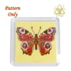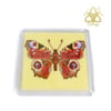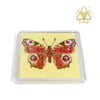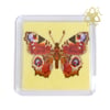 This coaster features a peacock butterfly, instantly recognizable for its rich red wings adorned with bold “eye” spots. Against a contrasting pale yellow background the butterfly appears to rest delicately..