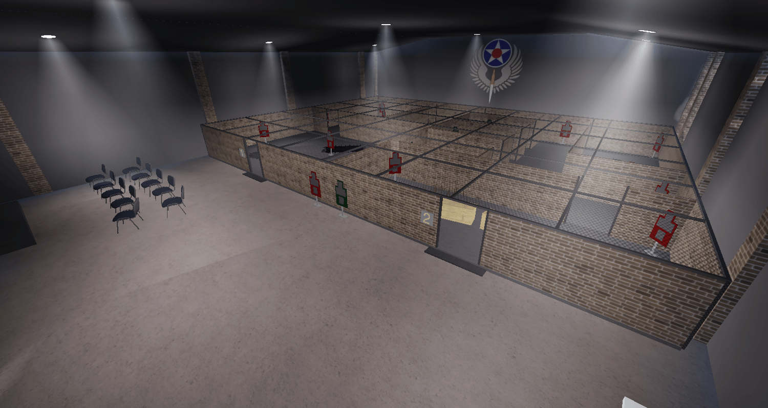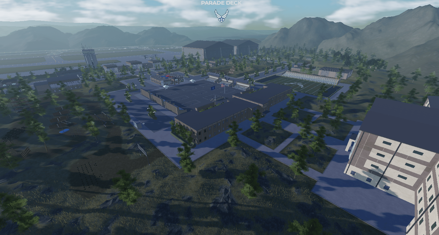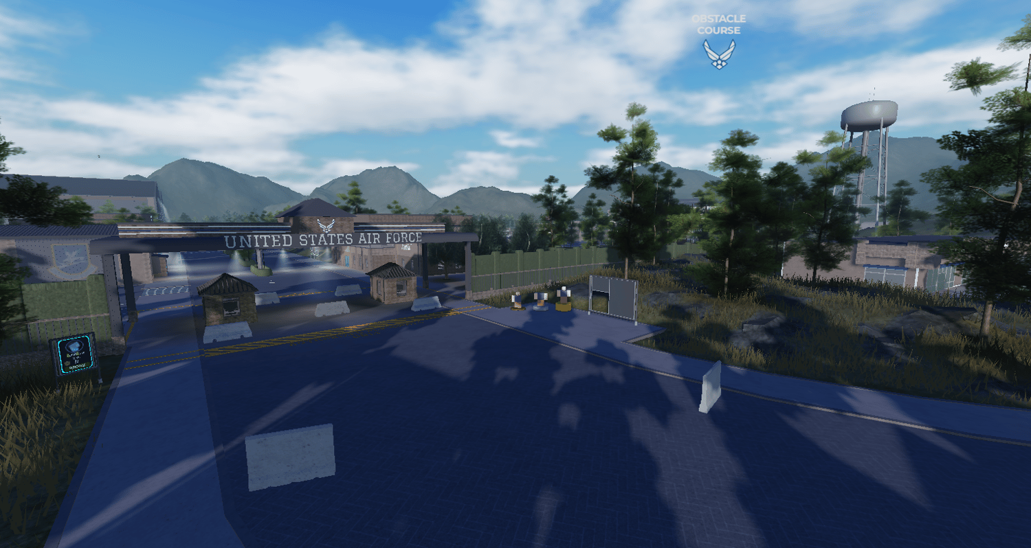 Uniform Rooms, Headquarters, Classrooms, Runways, ATC Tower, PVP combat area, main gate, Military Police Building (with jail), Recruitment center, Drill Pad, animations, Hangars (With working helicopters and airplanes), Basic Training Spawn