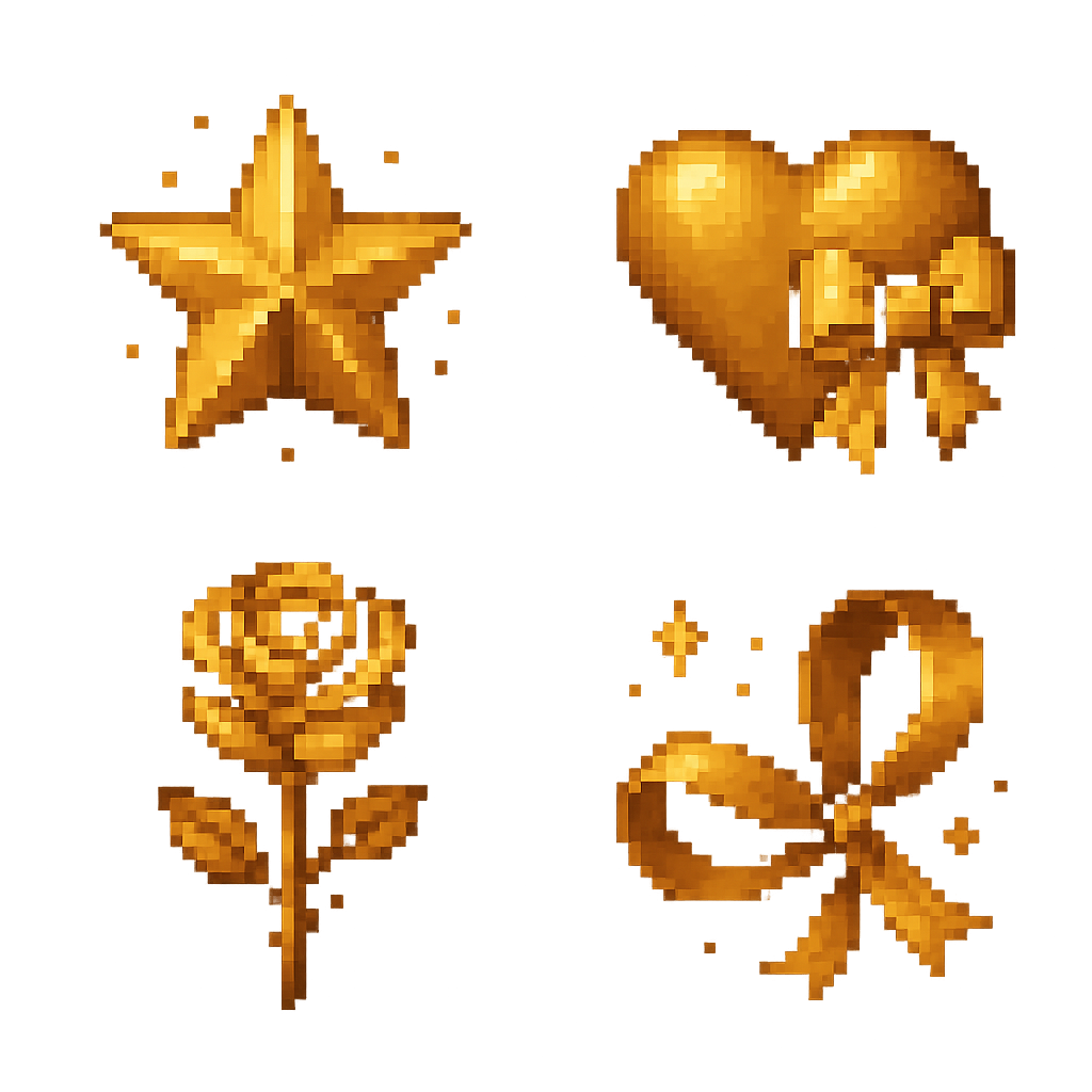 Luxury Gold Pixel Art Elements — Heart, Star, Rose & Ribbon Set