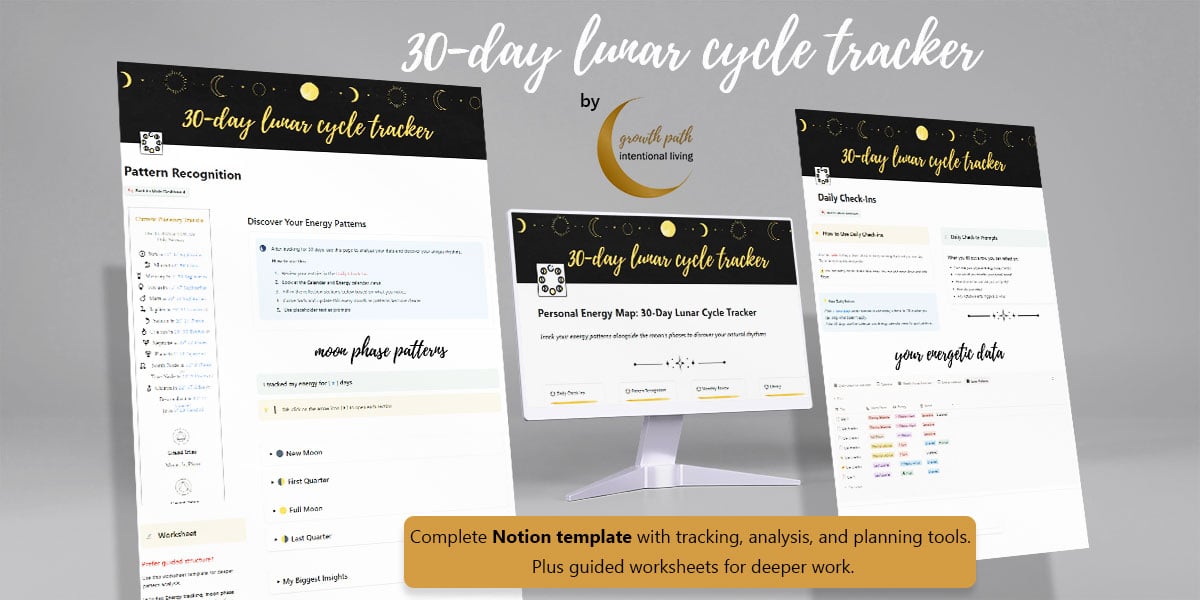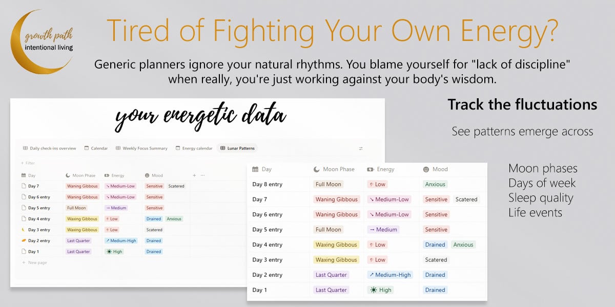 Track your energy patterns with moon phases to discover your natural rhythms. Notion template with daily tracking, pattern analysis, and monthly reviews. Instant digital download.