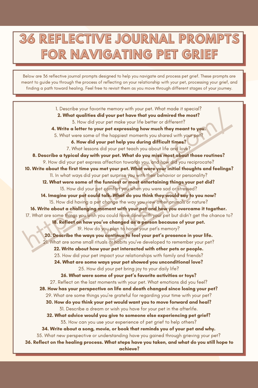This worksheet offers 36 reflective journal prompts designed to help an individual navigate and process pet grief. These prompts are meant to guide you through the process of reflecting on your relationship with your pet, processing your grief, and finding a path toward healing. The prompts can be revisited as you move through different stages of your journey.