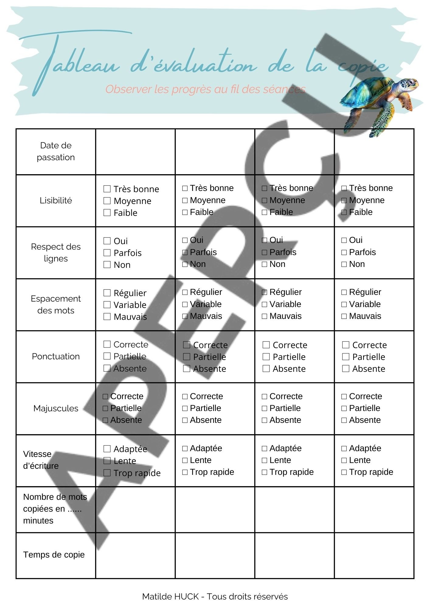 – Tableau d’évaluation pour suivre l’évolution de la copie au fil des séances : nombre de mots copiés, respect des majuscules, temps de copie et lisibilité.