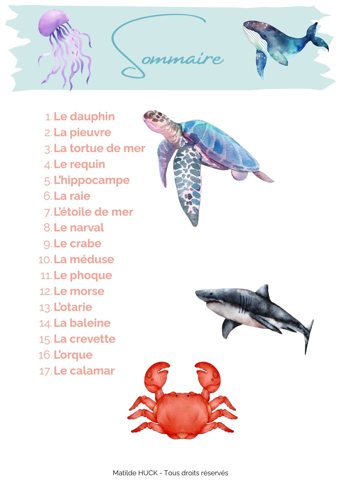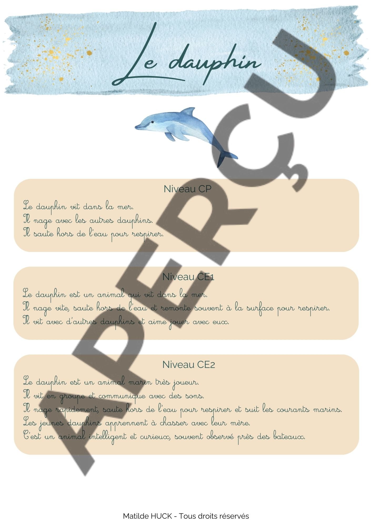 – 17 doubles pages sur 17 animaux marins différents, avec des textes adaptés selon 5 niveaux de difficulté : CP, CE1, CE2, CM1/CM2 et adulte.