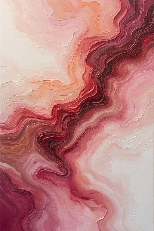 This mesmerizing abstract digital painting features dynamic, flowing waves of rich crimson, deep burgundy, soft blush pink, and warm peach blending seamlessly across a textured canvas. The organic curves and layered gradients evoke a sense of passionate movement, tactile silk, and emotional depth, creating an illusion of fluidity and sensuality. Inspired by modern fluid art and organic abstraction, the thick impasto-like brushstrokes and glossy highlights add dimension and sophistication. Perfect as a bold, contemporary statement piece for living rooms, bedrooms, or offices seeking premium abstract wall art with warm, inviting energy.
