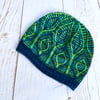 The Pavonis Hat is knit from the bottom up using only one colour yarn per round. Slipped stitches and delicate cables are used to create the eye-catching ‘feathers’ that from the ribbing up to the crown.