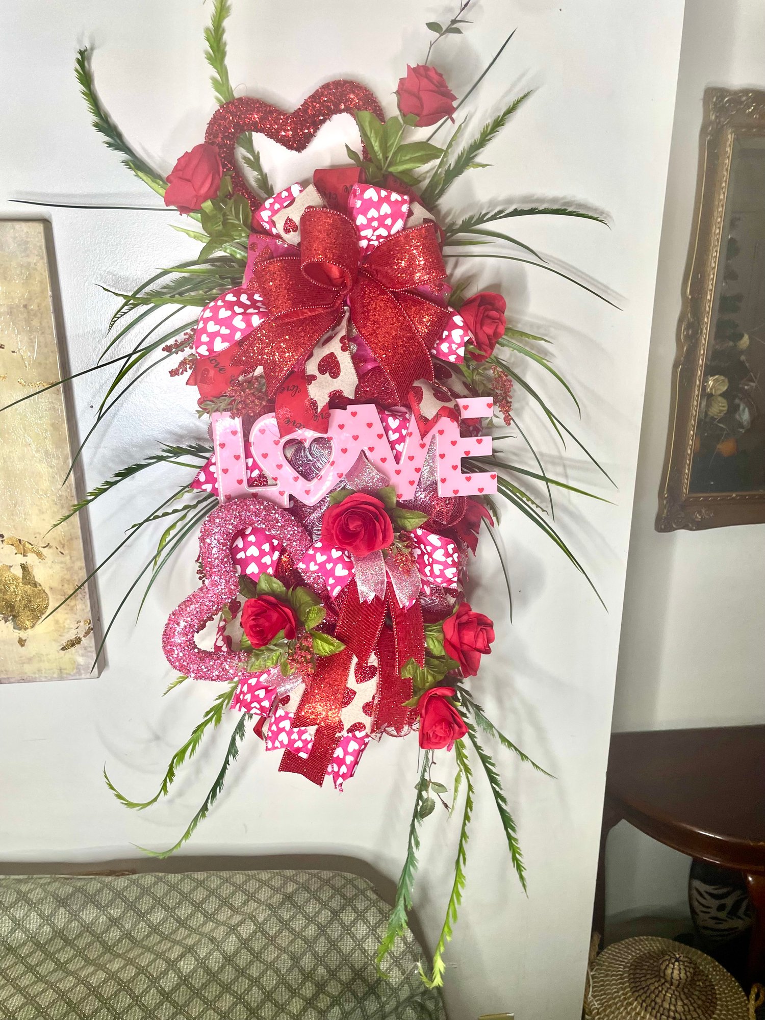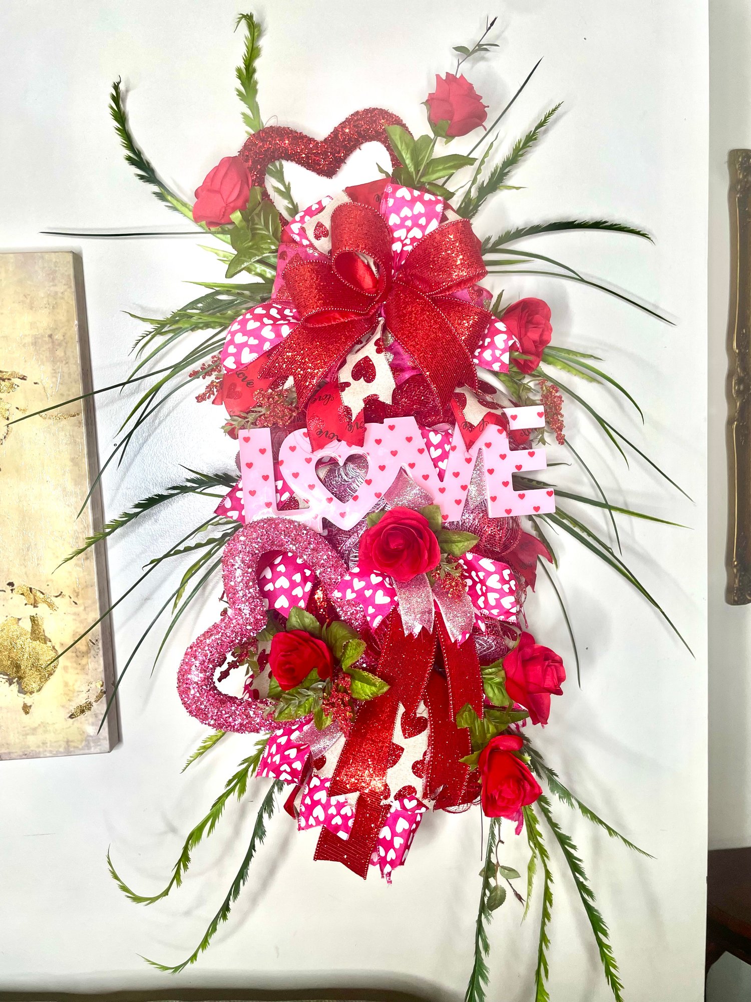 The centerpiece LOVE accent adds the perfect finishing touch, while sparkling textures and rich red tones create depth, movement, and undeniable visual impact. Each detail is thoughtfully arranged to give this piece a full, high-end look that stands out whether displayed on a door, wall, entryway, or as part of a seasonal décor collection.