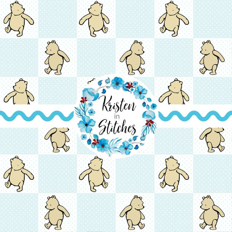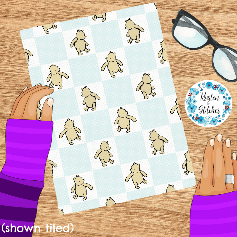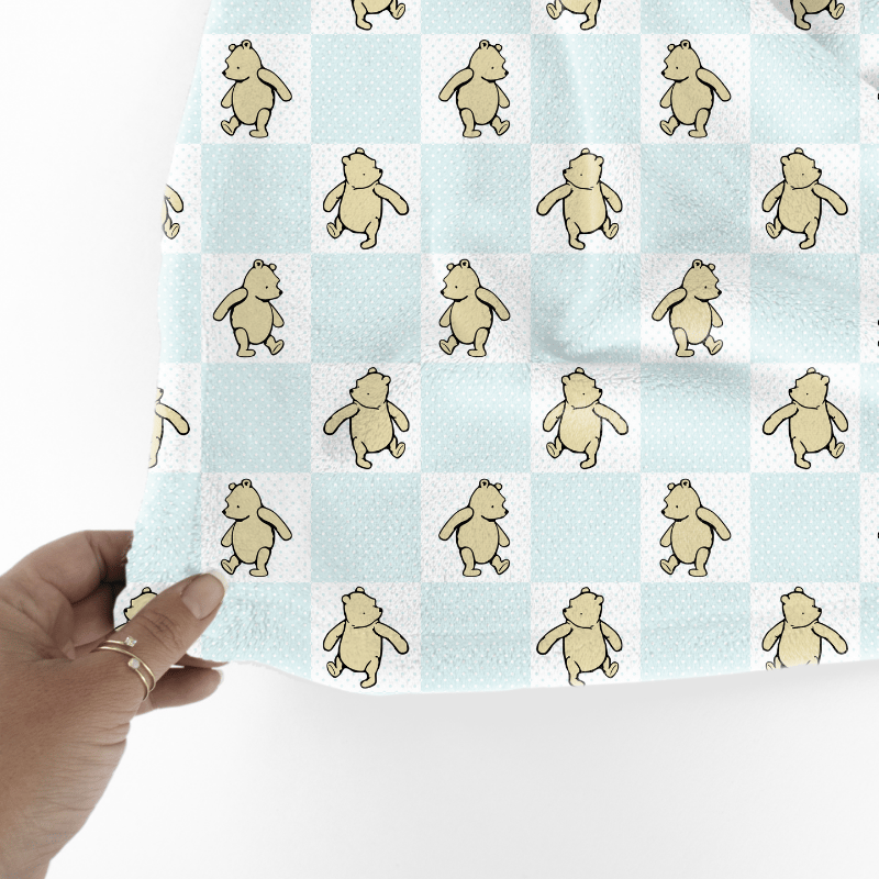 Classic Pooh in a baby blue checkerboard with polkadots.