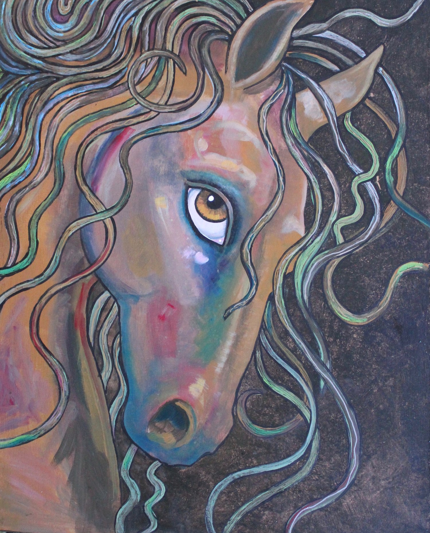 In this painting I wanted to make the connection between humans and horses. Thats why I gave the horse a human eye. Fighting for animal rights is not for the faint of heart. Every animal is tattooed on my soul.