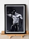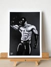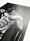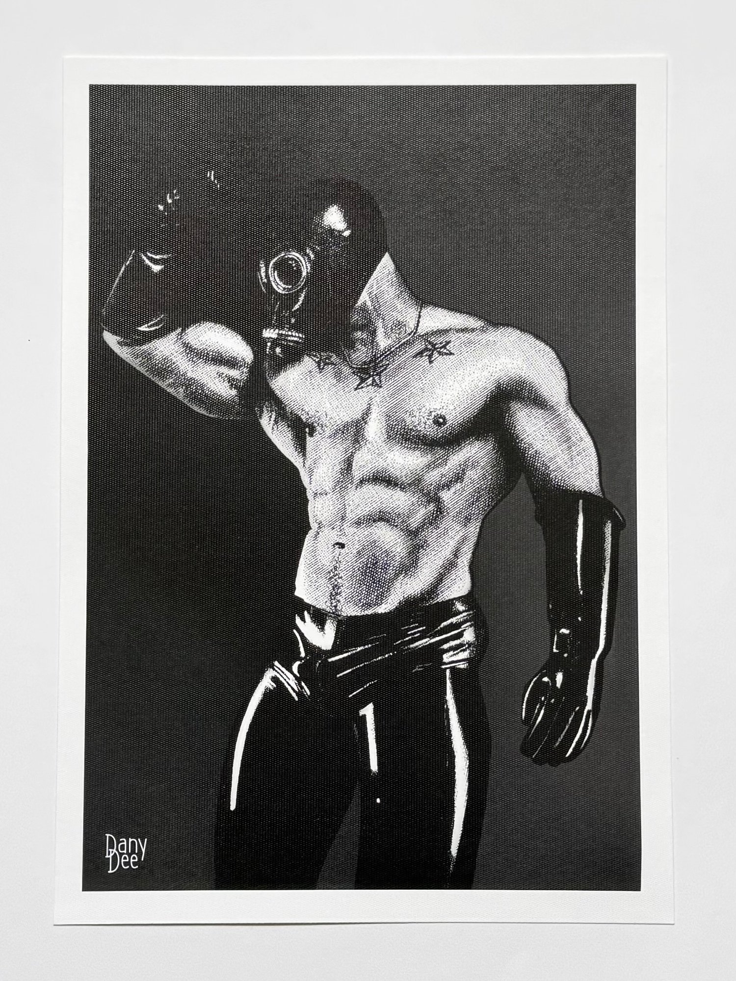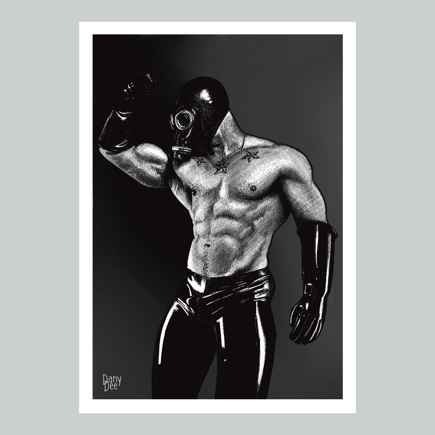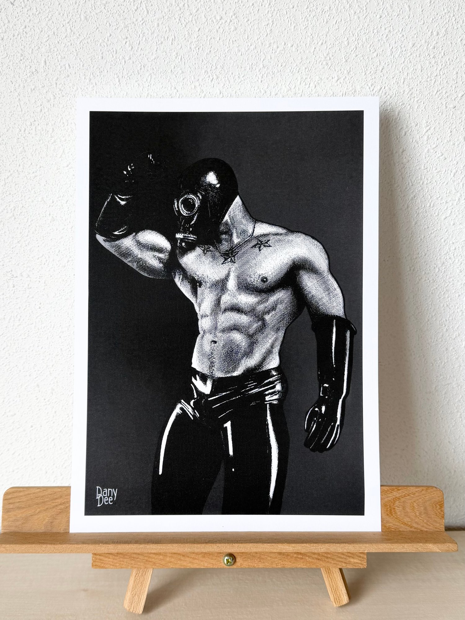 "The Latex" is a hand-drawn, monochromatic A4 art print celebrating latex fetish culture — a bold homoerotic illustration of a lean muscular man in a rubber gas mask, trousers and latex gloves, fist raised, chest bare, perfect for gay rubber fetish collectors or queer home decor.