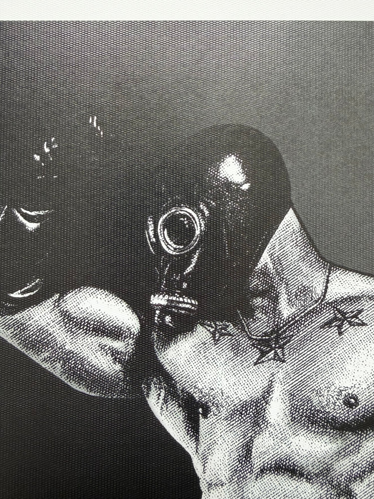 A lean, muscular man in a rubber gas mask and latex gloves — torso exposed, one arm raised in equal parts defiance and display. The deep black shine of the rubber against his luminous bare body. Hard and soft. Hidden and revealed. The mask removes the face but not the presence. If anything, it amplifies it.